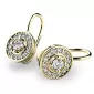 Nádherný model klasických náušníc zdobí tridsať oslňujúcich zirkónov briliantového brusu. Tieto žiarivé náušnice sú vyrobené zo žltého štrnásťkarátového zlata - 585/1000 v lesklej povrchovej úprave. Väčší stredový zirkón obklopuje štrnásť menších zirkónov v každej náušnici a opticky ich zväčšuje lesklý lem okolo zirkónov. Vďaka precíznemu brúsu zirkóny získali dokonalú brilanciu. Skvele odráža svetlo a september! Náušnice sa vyrábajú aj v bielom zlato a zapínajú sa na klapku. Vsadzovanie zirkónov vykonávajú naši najskúsenejší majstri zlatníci ručne pod mikroskopom s presnosťou na 0,01mm a preto nehrozí vypadnutie kamienkov ako to býva u strojne vyrábaných náušníc.