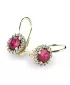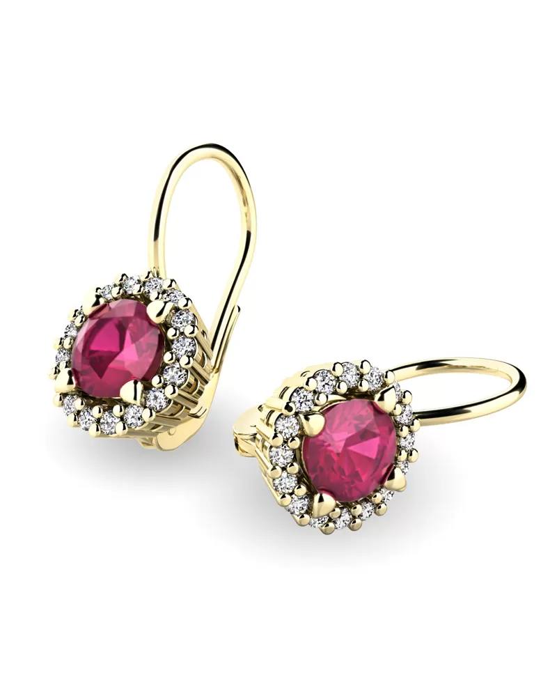 Nádherné luxusní dámské náušnice osázené středovým syntetickým rubínem a zirkony budou ideálním dárkem pro každou ženu. Náušnice jsou vyrobeny ze žlutého čtrnáctikarátového zlata - 585/1000 v lesklé povrchové úpravě. Vsazené zirkony jsou vybroušeny dokonalým briliantovým brusem, díky kterému dokonale odráží světlo a jejich brilance neuvěřitelně září z každého úhlu pohledu! Všechny kameny jsou pevně uchyceny krapnami. Vsazování kamenů provádějí naši nejzkušenější mistři zlatníci ručně pod mikroskopem s přesností na 0,01mm a proto nehrozí vypadnutí kamínků jako to bývá u strojně vyráběných náušnic. Celé náušnice působí dokonalým a luxusním dojmem!