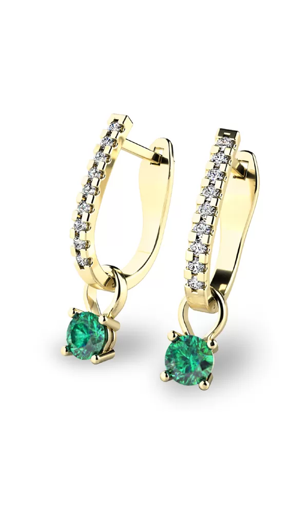 Náušnice "podkovičky" patria medzi veľmi obľúbený typ náušníc, ktoré sú vhodné na každodenné nosenie aj na spoločenské akcie a pristanú každej žene. Tento model je zdobený osemnástimi zirkónmi a dvoma syntetickými smaragdmi vsadenými do príveskov. Všetky kamene sú v briliantovom bruse, vďaka ktorému dokonale odráža svetlo a neuveriteľné september. Vsadzovanie kameňov vykonávajú naši najskúsenejší majstri zlatníci ručne pod mikroskopom s presnosťou na 0,01 mm a preto nehrozí vypadnutie kamienkov ako to býva u strojne vyrábaných náušníc. Tieto nádherné náušnice sú vyrobené zo žltého štrnásťkarátového zlata - 585/1000 v lesklej povrchovej úprave.
