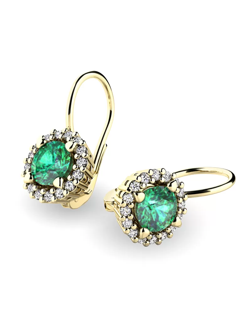 Nádherné luxusní dámské náušnice osázené středovým syntetickým smaragdem a zirkony budou ideálním dárkem pro každou ženu. Náušnice jsou vyrobeny ze žlutého  čtrnáctikarátového zlata - 585/1000 v lesklé povrchové úpravě. Vsazené zirkony jsou vybroušeny dokonalým briliantovým brusem, díky kterému dokonale odráží světlo a jejich brilance neuvěřitelně září z každého úhlu pohledu!  Všechny kameny jsou pevně uchyceny krapnami. Vsazování kamenů provádějí naši nejzkušenější mistři zlatníci ručně pod mikroskopem s přesností na 0,01mm a proto nehrozí vypadnutí kamínků jako to bývá u strojně vyráběných náušnic. Celé náušnice působí dokonalým a luxusním dojmem!