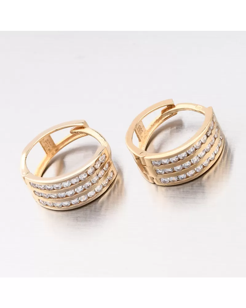 Mäkké, ale výrazné náušnice zdobené tromi radmi šumivých zirkónov. Zirkóny sú brilantné brúsenie, ktoré zaisťujú maximálnu brilanciu leštenej aspektu, dokonale odrážajú svetlo a neuveriteľne svieti zo všetkých pohľadov. Kruhy sú jedným z starých príslušenstiev, ktoré musí mať každá žena vo svojej šperkovej skrinke. Náušnice sú vhodné na každodenné nosenie a fantastické upevnenie vďaka ich konštrukcii, ktorá jednoducho zaskočí a drží, bude ideálnym klenotom.