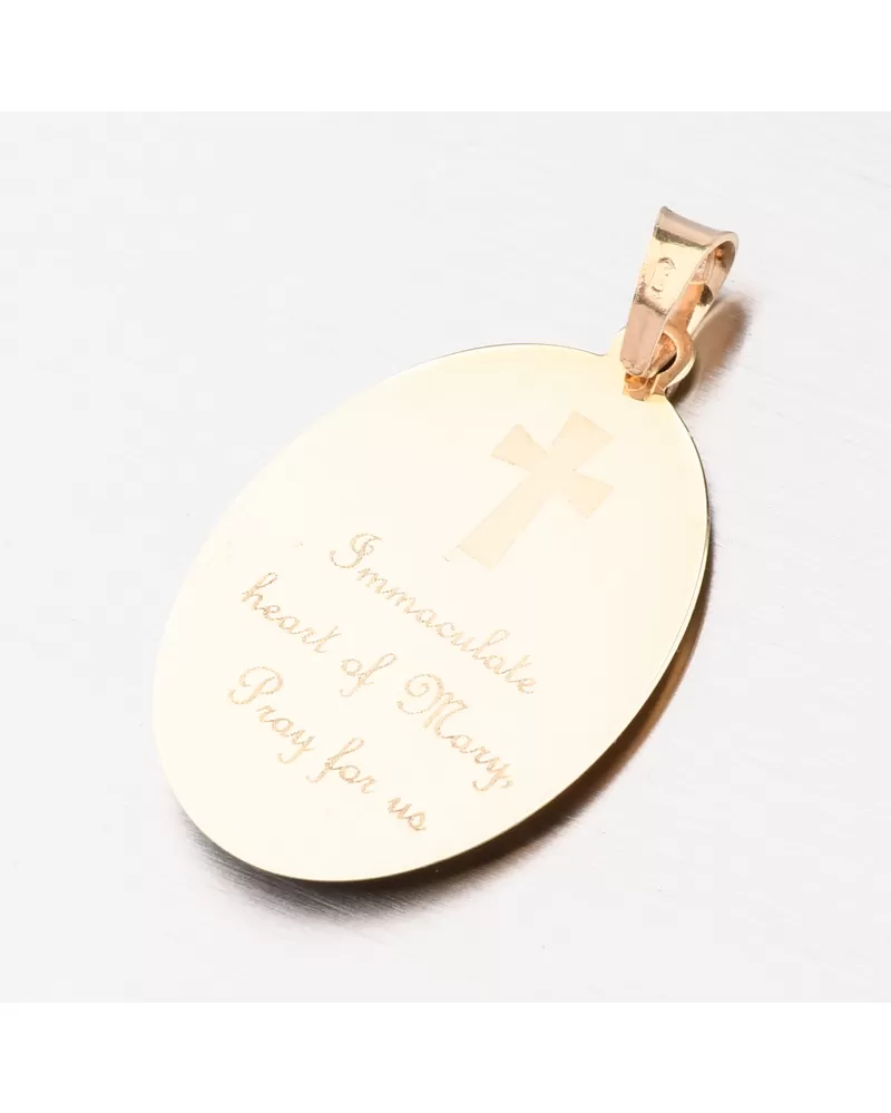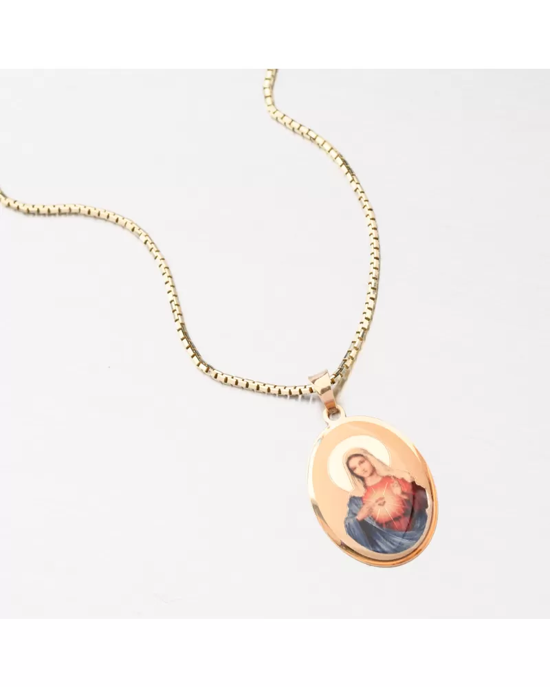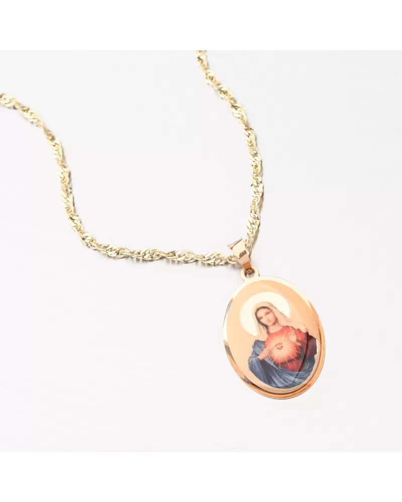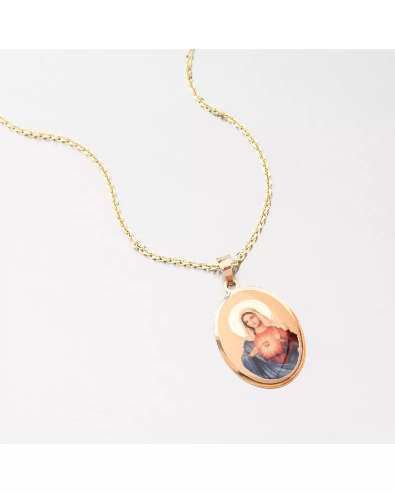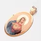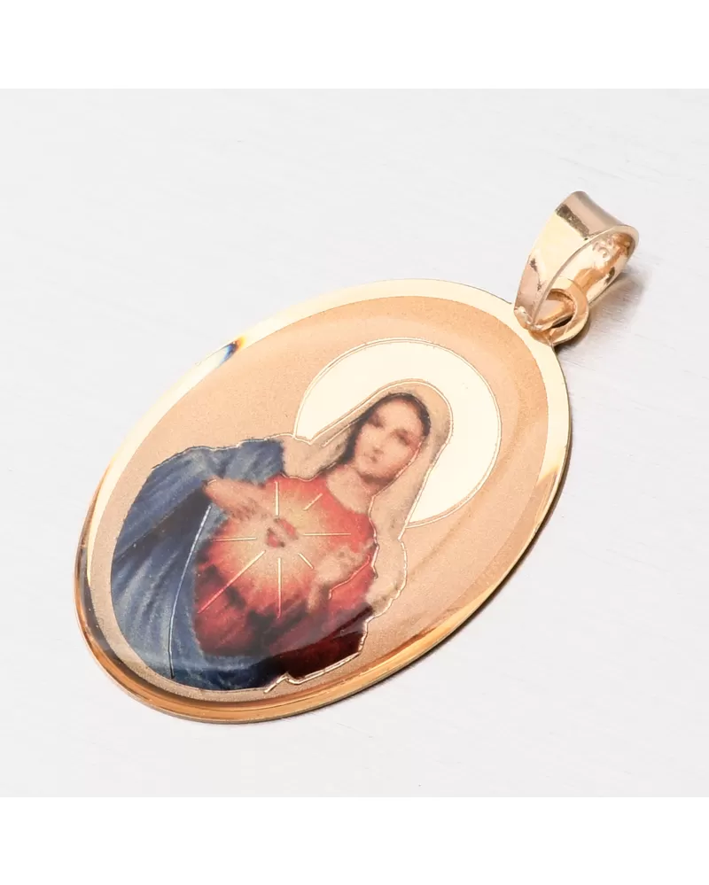 Zlatý medailón v oválnom tvare je zdobený zobrazenou Pannou Márou. Zlatý prívesok je v jemnom dizajne a príjemne dodržiava dekolt. Ženy a muži sa potešia. Zlatý prívesok je vyrobený zo žltých štrnástich -karátových zlatých 585/1000 v lesklom povrchu.
