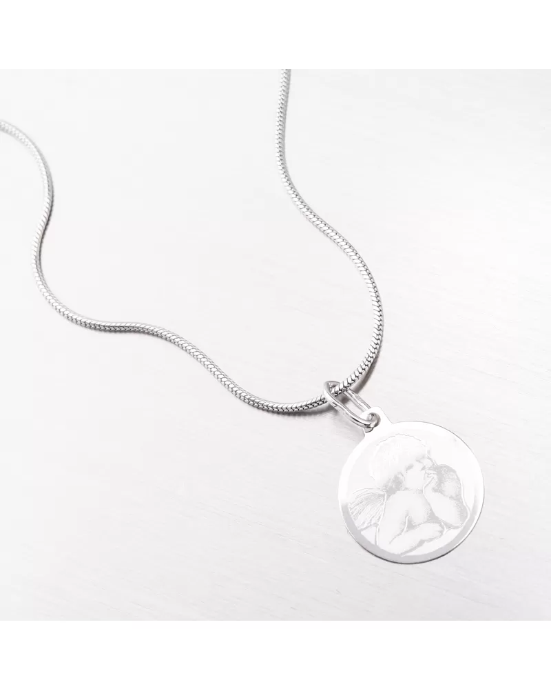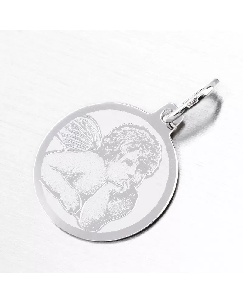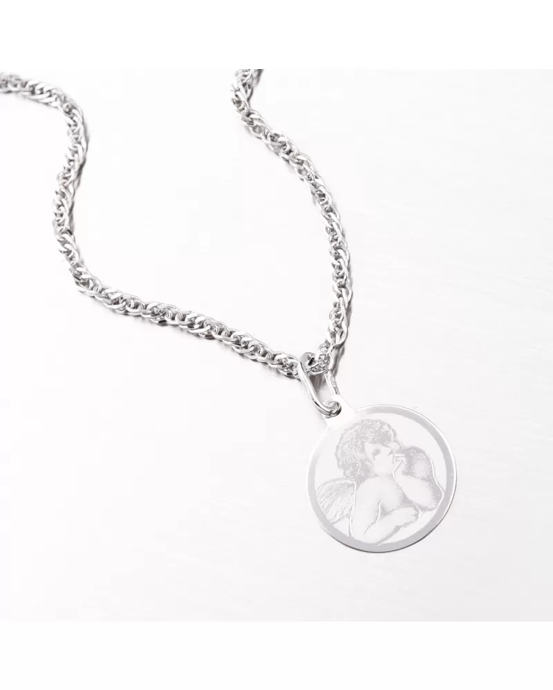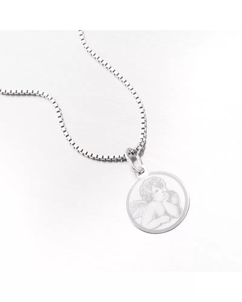 Prívesok je vyrobený z bieleho štrnástich -Zlato 585/1000. Zlatý prívesok sa môže pochváliť roztomilým anjelom na prednej strane, ktorý zvýrazňuje matný povrch. Budete potešiť mužov a ženu so zlatým príveskom. Na prívesku je možné nechať rytie na chrbte. Napr. Meno, dátum, odhodlanie. Prívesok na rytie sa hodí ako perfektný darček pre vášho milovaného. Zadajte podrobnosti do poľa „Gravírovanie“.