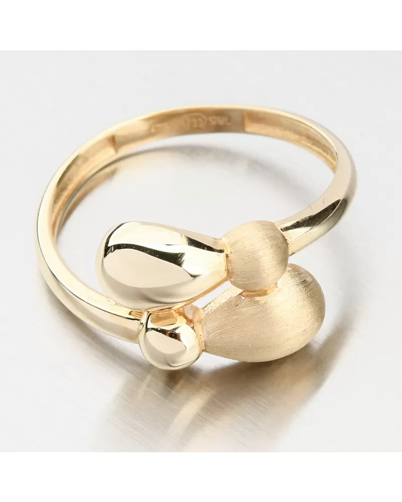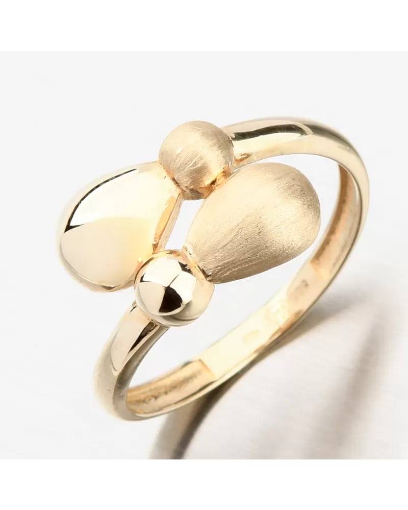 Jedinečný zlatý prsteň, ktorý zaujme umeleckým spracovaním a kombináciou lesklých a matných povrchov. Dva prvky v tvare kvapky spolu s okrúhlymi ornamentami vytvárajú harmonickú kompozíciu. Tento prsteň predstavuje dokonalú rovnováhu medzi eleganciou a originalitou. Vďaka inovatívnemu dizajnu sa hodí ako na denné nosenie, tak aj ako výrazný doplnok na spoločenské udalosti.
