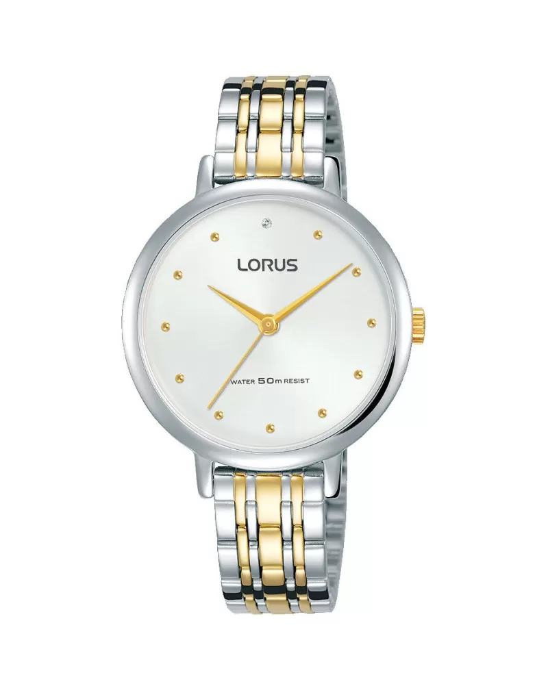 Dámske hodinky značky Lorus, ktoré sú v obľúbenej bi-color prevedení. Výrazné oceľové puzdro a remienok je s čiastočným PVD pozlátením vo farbe žltého zlata.