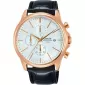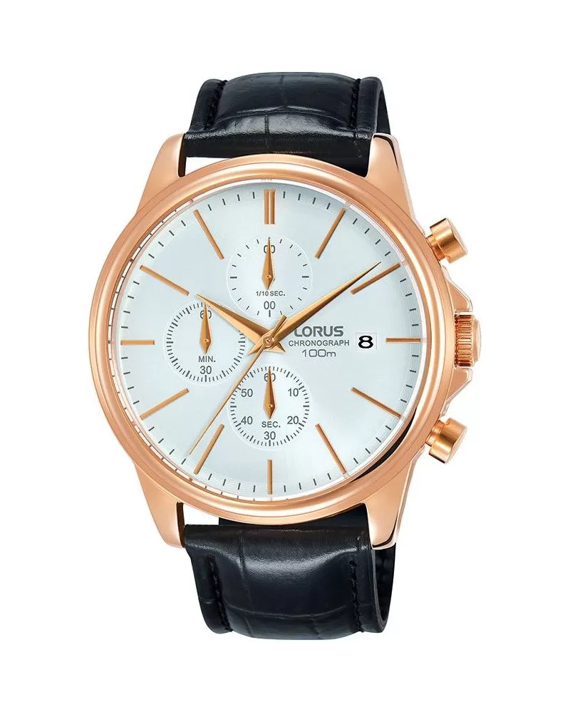 Elegantný model pánskych hodiniekLorus s čiernym koženým remienkom a oceľovým puzdrom s PVD pozlátením vo farbe ružového zlata. Tieto hodinky skvele doplnia Váš outfit a to či už na formálne alebo na voľnočasové príležitosti.