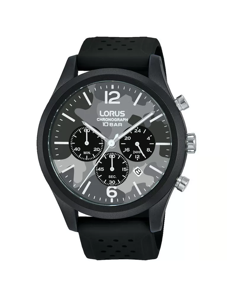Pánske maskáčové hodinky Lorus RT397HX9 na Quartz pohon na batériu. Hodinky sú v športovom dizajne, ale zaručene hodinky oceníte aj na každodenné nosenie. Plastové čierne puzdro, šedý maskáčový ciferník a silikónový remienok v čiernej farbe, ktorý bude pohodlný aj po celodennom nosení. Ďalej oeníte vodotesnosť 100m, minerálne sklíčko, ukazovateľ dátumu, stopky a skrutkovacie dynko.