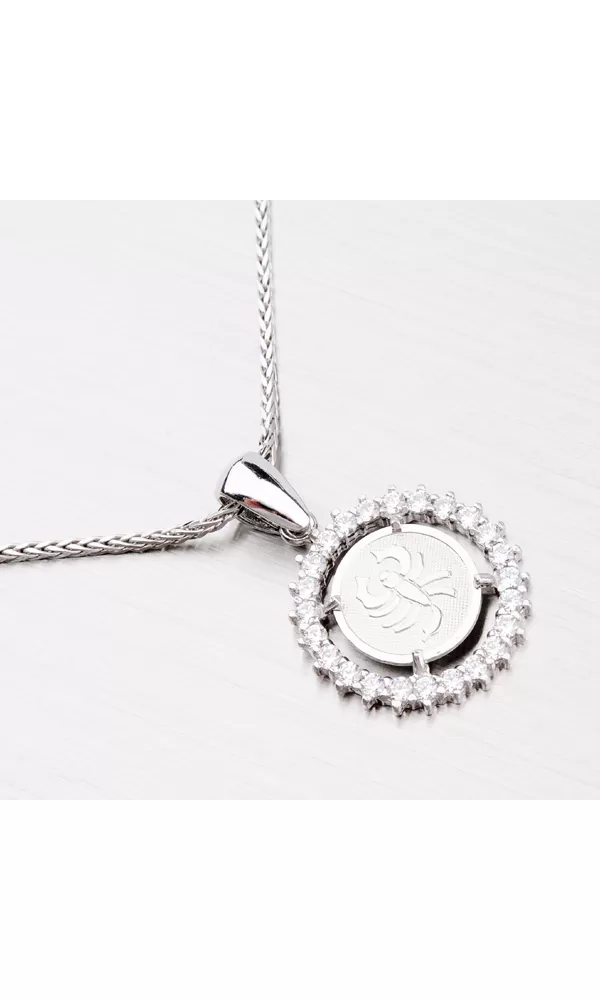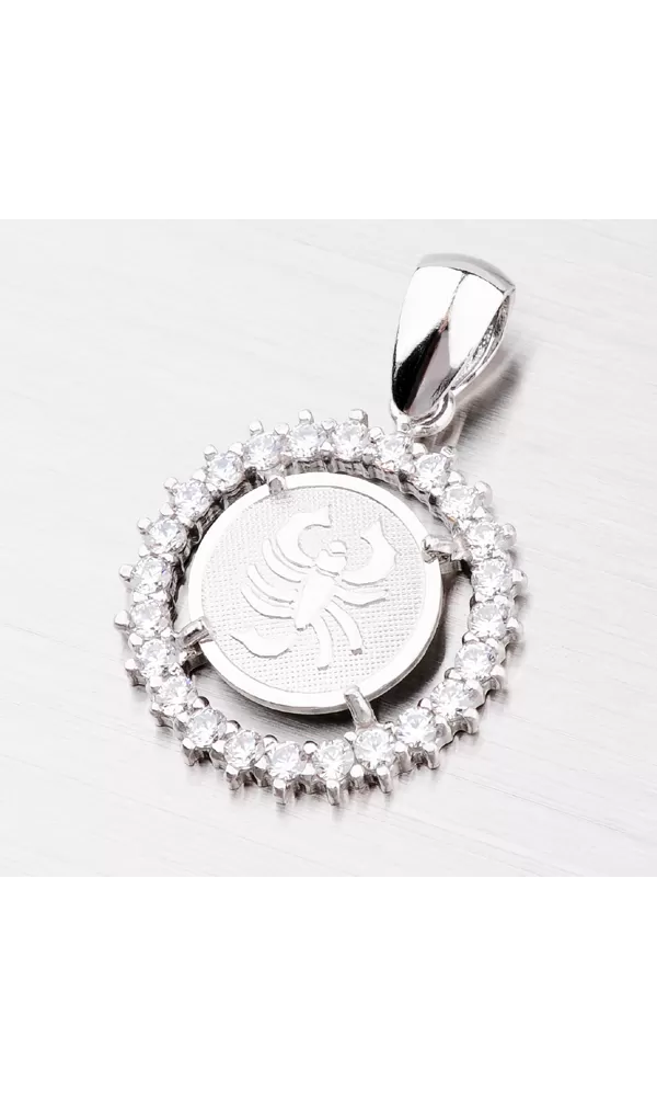 Tento nádherný prívesok okrúhleho tvaru s motívom znamenia zverokruhu - Škorpión (24.10.-22.11.) je vyrobený zo striebra rýdzosti 925/1000 v kombinácii lesklej a matnej povrchovej úpravy s rhodiovaním. Dookola je vysadený trblietavými zirkónmi, ktoré prívesok rozžiaria. K prívesku je vhodné použiť retiazku o max. priemere 3 mm.