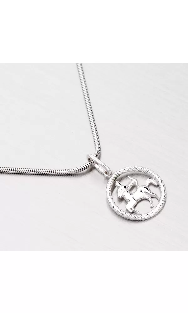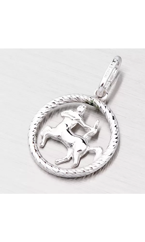 Strieborný prívesok s motívom znamenia zverokruhu - Strelec (22.11.-21.12.), ktorý je vsadený do krásneho gravírovaného kruhu je vyrobený zo striebra rýdzosti 925/1000 v lesklej úprave s rhodiovaním. K prívesku je vhodné použiť retiazku o max. priemere 2,50 mm.