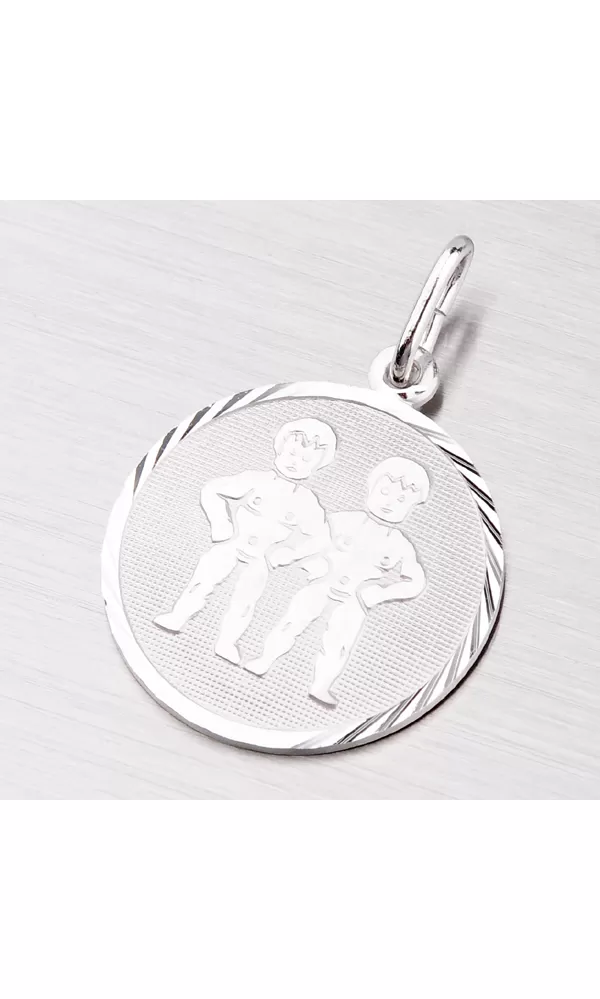 Tento prívesok okrúhleho tvaru s motívom znamenia zverokruhu - Blíženci (22.5.-21.6.) je vyrobený zo striebra rýdzosti 925/1000 v kombinácii lesklej a matnej povrchovej úpravy s rhodiovaním,