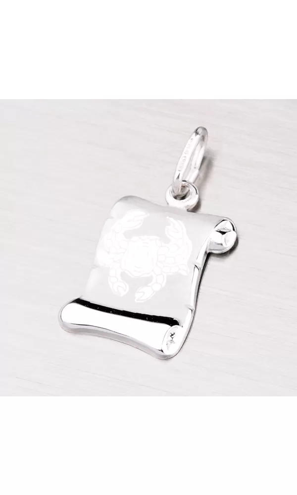 Strieborný prívesok pergamen s motívom znamenia zverokruhu - Rak (22.6.-22.7.) je vyrobený zo striebra rýdzosti 925/1000 v kombinácii lesklej a matnej povrchovej úpravy s rhodiovaním.