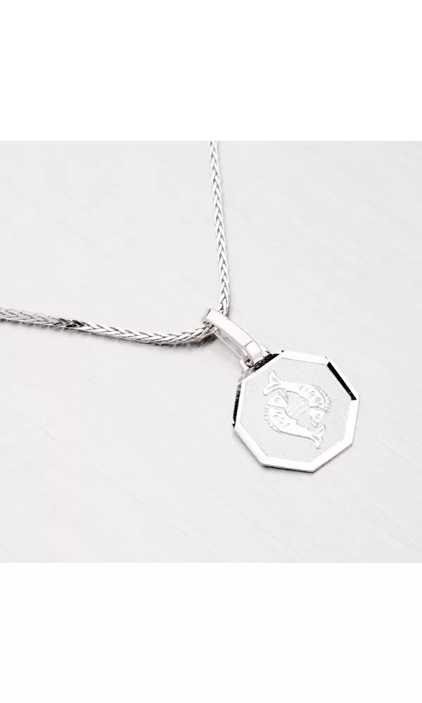 Strieborný prívesok s motívom znamenia zverokruhu - Ryby (21.2.-20.3.) je vyrobený zo striebra rýdzosti 925/1000 v kombinácii lesklej a matnej povrchovej úpravy s rhodiovaním. Lesklý rámček doštičky je zvýraznený facetami, ktoré sú prevedené diamantovým nástrojom, ktorý dodáva facetám maximálny lesk a brilanciu zo všetkých uhlov pohľadu.
