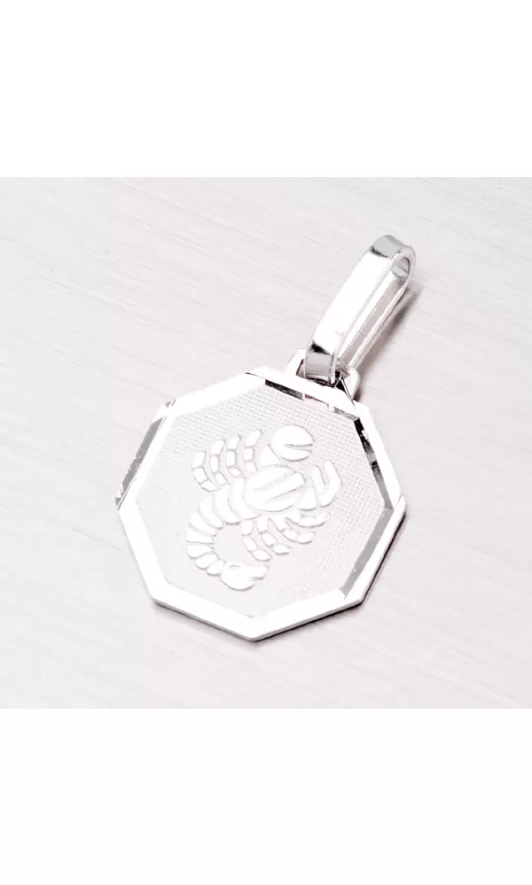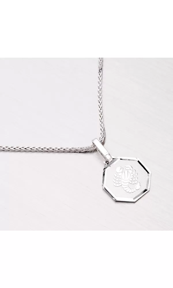 Strieborný prívesok s motívom znamenia zverokruhu - Škorpión (24.10.-22.11.) je vyrobený zo striebra rýdzosti 925/1000 v kombinácii lesklej a matnej povrchovej úpravy s rhodiovaním. Lesklý rámček doštičky je zvýraznený facetami, ktoré sú prevedené diamantovým nástrojom, ktorý dodáva facetám maximálny lesk a brilanciu zo všetkých uhlov pohľadu.