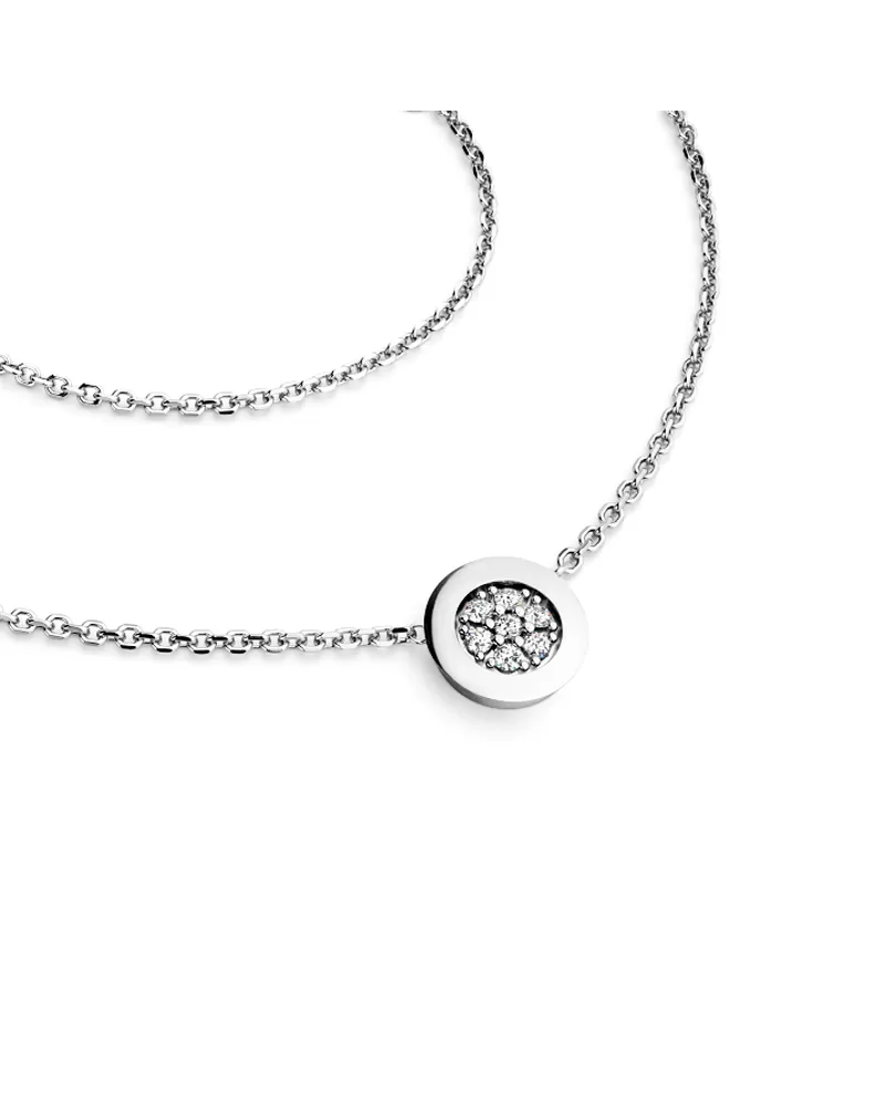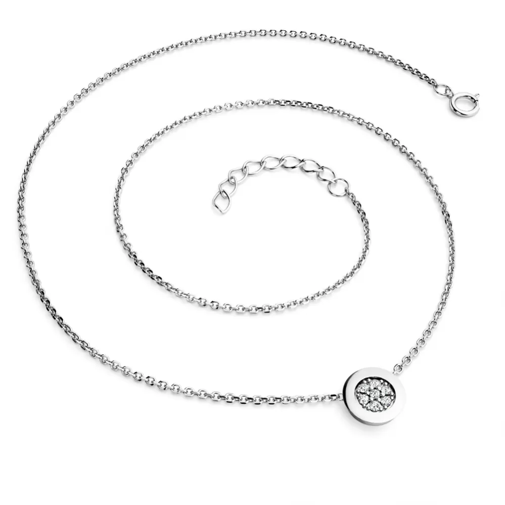 Elegantný náhrdelník je vyrobený z bieleho štrnásť karátového zlata - 585/1000 a pozostáva z retiazky kotvičkového typu s lesklými fazetami na každom článku. Fazety sú vyrábané diamantovým nástrojom, ktorý dáva výsledným fazetám maximálny lesk. V strede retiazky je okrúhla ozdoba, v ktorej je vsadených sedem okrúhlych diamantov vybrúsených briliantovým brusom. Briliantový brus dodáva diamantom maximálnu brilanciu brúsených faziet, dokonale odráža svetlo a neuveriteľne svieti z každého uhla! Diamanty osádzajú naši najskúsenejší majstri zlatníci ručne pod mikroskopom s presnosťou 0,01 mm, a preto nehrozí vypadnutie kameňov ako pri strojovo vyrábaných šperkoch.