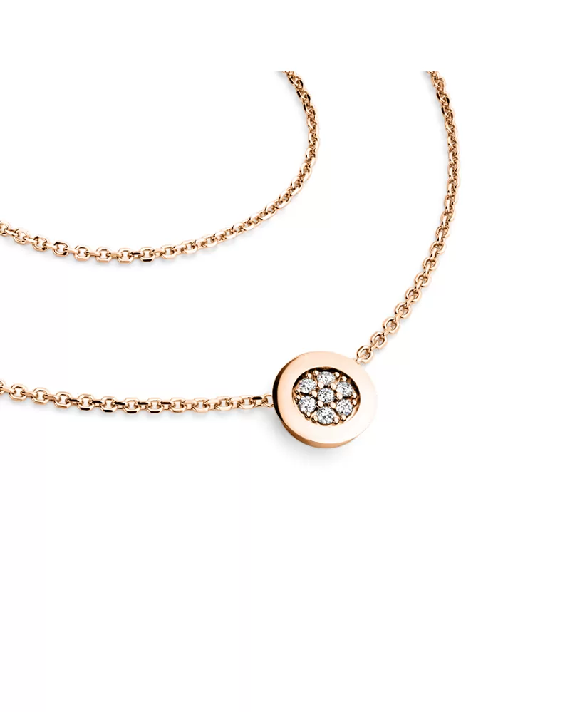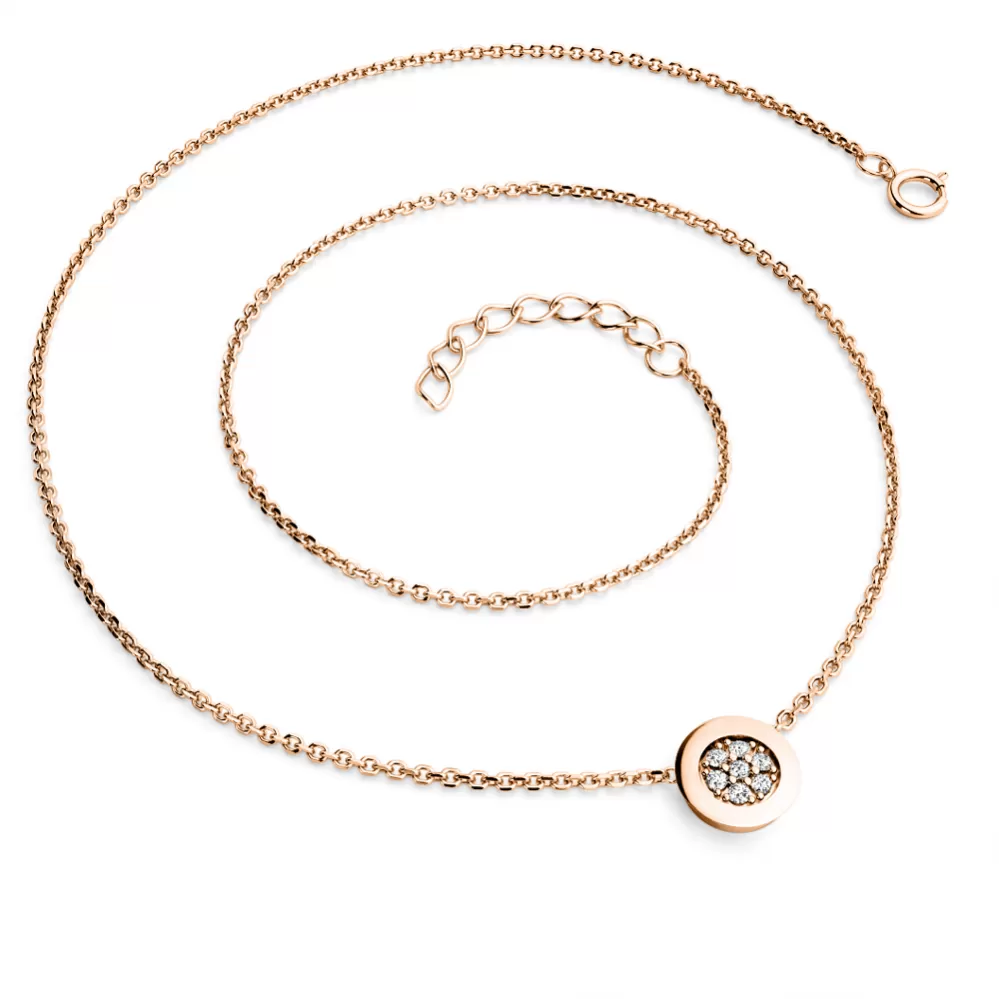 Elegantný náhrdelník je vyrobený zo 14 karátového ružového zlata - 585/1000 a pozostáva z retiazky kotvičkového typu s lesklými fazetami na každom článku. Fazety sú vyrábané diamantovým nástrojom, ktorý dáva výsledným fazetám maximálny lesk. V strede retiazky je okrúhla ozdoba, v ktorej je vsadených sedem okrúhlych diamantov vybrúsených briliantovým brusom. Briliantový brus dodáva diamantom maximálnu brilanciu brúsených faziet, dokonale odráža svetlo a neuveriteľne svieti z každého uhla! Diamanty osádzajú naši najskúsenejší majstri zlatníci ručne pod mikroskopom s presnosťou 0,01 mm, a preto nehrozí vypadnutie kameňov ako pri strojovo vyrábaných šperkoch.