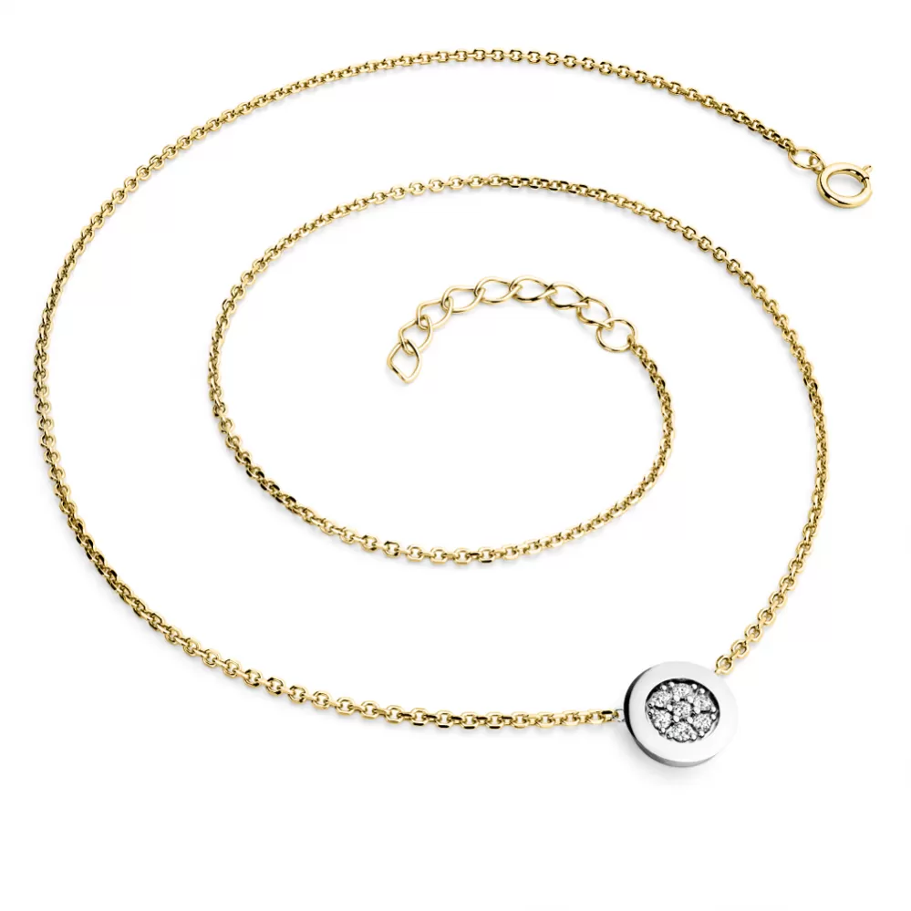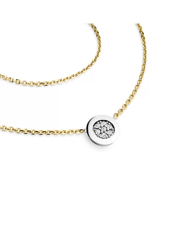 Elegantný náhrdelník je vyrobený z kombinácie žltého a bieleho štrnásť karátového zlata - 585/1000 a pozostáva z retiazky kotvičkového typu s lesklými fazetami na každom článku. Fazety sú vyrábané diamantovým nástrojom, ktorý dáva výsledným fazetám maximálny lesk. V strede retiazky je okrúhla ozdoba, v ktorej je vsadených sedem okrúhlych diamantov vybrúsených briliantovým brusom. Briliantový brus dodáva diamantom maximálnu brilanciu brúsených faziet, dokonale odráža svetlo a neuveriteľne svieti z každého uhla! Diamanty osádzajú naši najskúsenejší majstri zlatníci ručne pod mikroskopom s presnosťou 0,01 mm, a preto nehrozí vypadnutie kameňov ako pri strojovo vyrábaných šperkoch.
