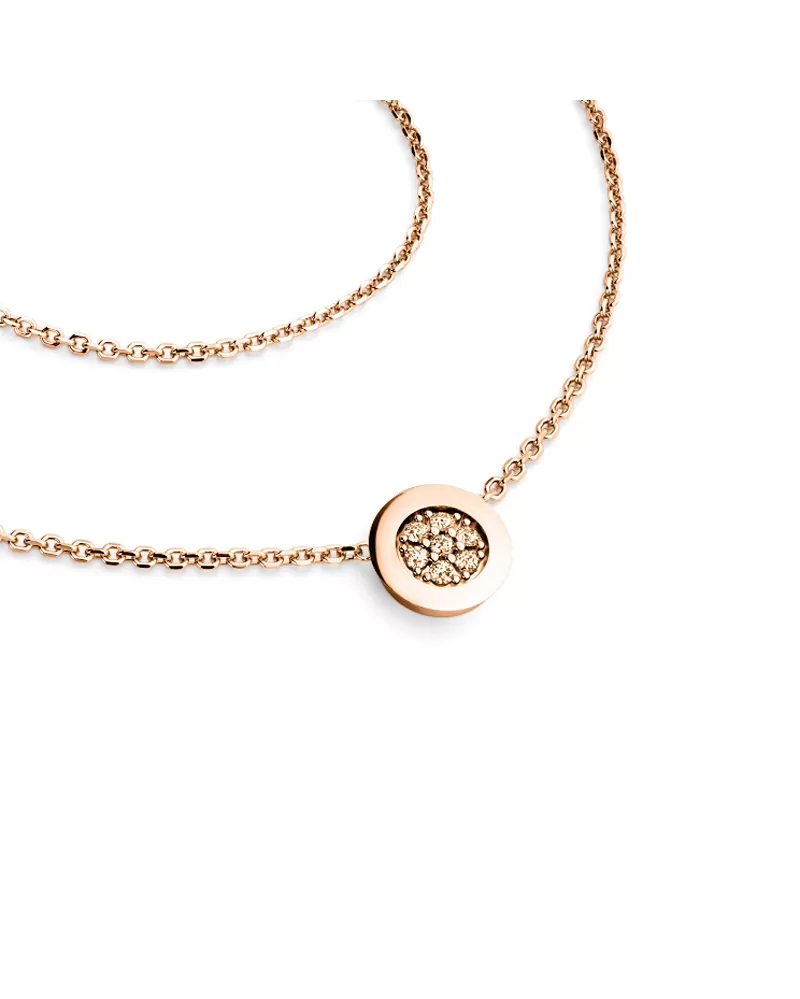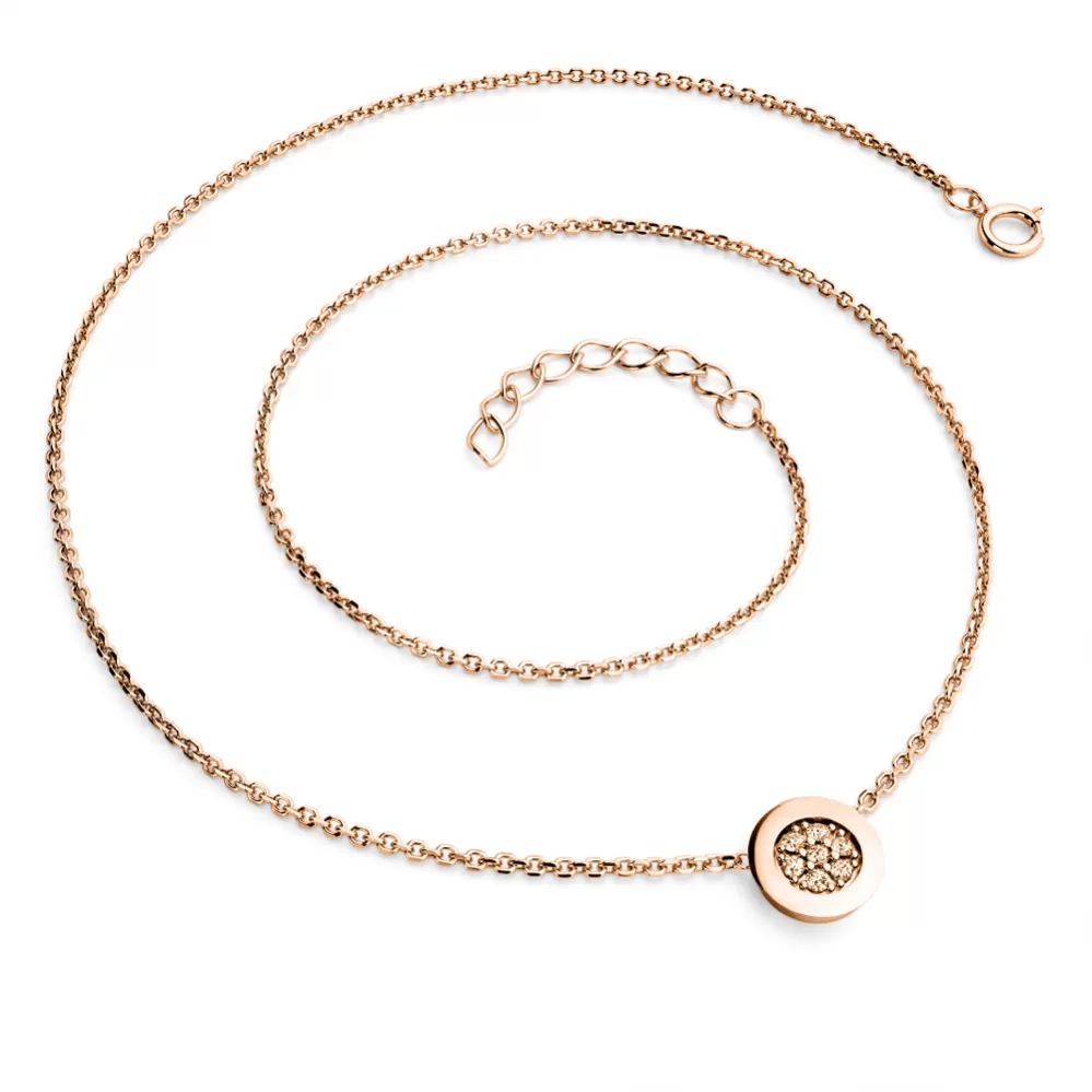 Elegantný náhrdelník je vyrobený zo 14 karátového ružového zlata - 585/1000 a pozostáva z retiazky kotvičkového typu s lesklými fazetami na každom článku. Fazety sú vyrábané diamantovým nástrojom, ktorý dáva výsledným fazetám maximálny lesk. V strede retiazky je okrúhla ozdoba, v ktorej je osadených sedem okrúhlych diamantov farby Champagne vybrúsených briliantovým brusom. Briliantový brus dodáva diamantom maximálnu brilanciu brúsených faziet, dokonale odráža svetlo a neuveriteľne svieti z každého uhla! Diamanty osádzajú naši najskúsenejší majstri zlatníci ručne pod mikroskopom s presnosťou 0,01 mm, a preto nehrozí vypadnutie kameňov ako pri strojovo vyrábaných šperkoch.
