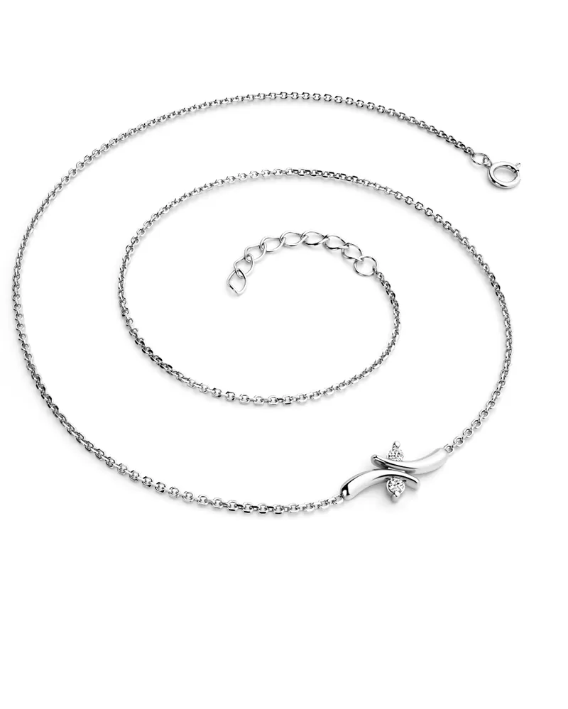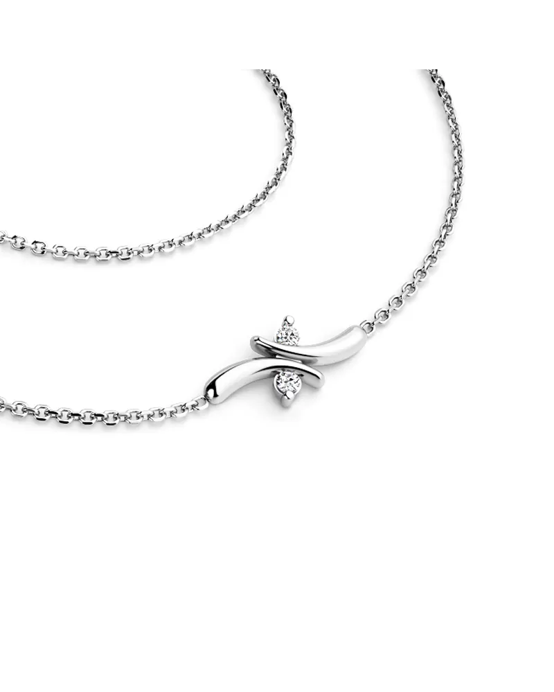 Jednoduchý elegantní náhrdelník je vyrobený z bílého čtrnáctikarátového zlata - 585/1000 a tvoří ho řetízek typu anker s lesklými facetami na každém očku. Facety jsou zhotoveny diamantovým nástrojem, který dodává vzniklým facetám maximální lesk. Uprostřed řetízku je ozdoba s dvěma kulatými diamant briliantového brusu, který zajišťuje maximální brilanci vybroušených facet, dokonale odráží světlo a neuvěřitelné září z každého úhlu pohledu! Vsazování diamantů provádějí naši nejzkušenější mistři zlatníci ručně pod mikroskopem s přesností na 0,01mm a proto nehrozí vypadnutí kamínků jako to bývá u strojně vyráběných šperků.