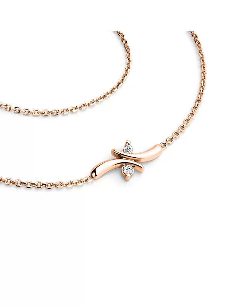 Jednoduchý elegantní náhrdelník je vyrobený z růžového čtrnáctikarátového zlata - 585/1000 a tvoří ho řetízek typu anker s lesklými facetami na každém očku. Facety jsou zhotoveny diamantovým nástrojem, který dodává vzniklým facetám maximální lesk. Uprostřed řetízku je ozdoba s dvěma kulatými diamant briliantového brusu, který zajišťuje maximální brilanci vybroušených facet, dokonale odráží světlo a neuvěřitelně září z každého úhlu pohledu! Vsazování diamantů provádějí naši nejzkušenější mistři zlatníci ručně pod mikroskopem s přesností na 0,01mm a proto nehrozí vypadnutí kamínků jako to bývá u strojně vyráběných šperků.
