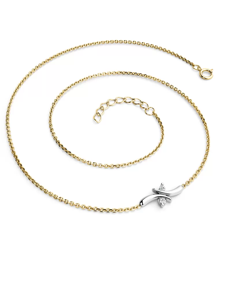 Jednoduchý elegantní náhrdelník je vyrobený ze žlutého a bílého čtrnáctikarátového zlata - 585/1000 a tvoří ho řetízek typu anker s lesklými facetami na každém očku. Facety jsou zhotoveny diamantovým nástrojem, který dodává vzniklým facetám maximální lesk. Uprostřed řetízku je ozdoba s dvěma kulatými diamant briliantového brusu, který zajišťuje maximální brilanci vybroušených facet, dokonale odráží světlo a neuvěřitelně září z každého úhlu pohledu! Vsazování diamantů provádějí naši nejzkušenější mistři zlatníci ručně pod mikroskopem s přesností na 0,01mm a proto nehrozí vypadnutí kamínků jako to bývá u strojně vyráběných šperků.