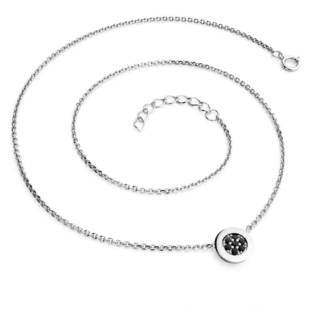 Elegantný náhrdelník je vyrobený z bieleho štrnásť karátového zlata - 585/1000 a pozostáva z retiazky kotvičkového typu s lesklými fazetami na každom článku. Fazety sú vyrábané diamantovým nástrojom, ktorý dáva výsledným fazetám maximálny lesk. V strede retiazky je okrúhla ozdoba, v ktorej je osadených sedem okrúhlych čiernych diamantov vybrúsených briliantovým brusom. Diamanty osádzajú naši najskúsenejší majstri zlatníci ručne pod mikroskopom s presnosťou 0,01 mm, a preto nehrozí vypadnutie kameňov ako pri strojovo vyrábaných šperkoch.
