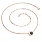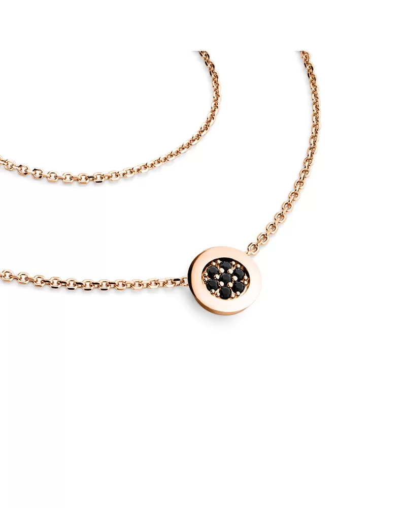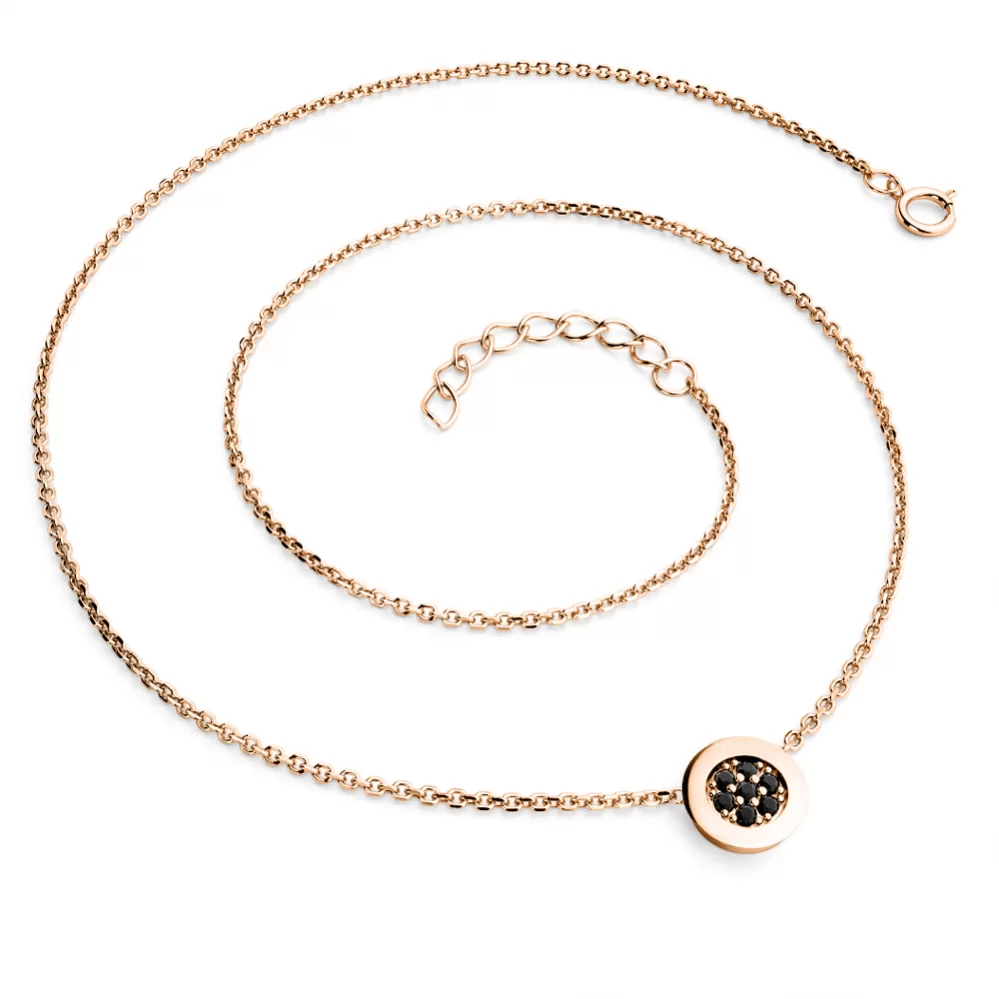 Elegantný náhrdelník je vyrobený zo 14 karátového ružového zlata - 585/1000 a pozostáva z retiazky kotvičkového typu s lesklými fazetami na každom článku. Fazety sú vyrábané diamantovým nástrojom, ktorý dáva výsledným fazetám maximálny lesk. V strede retiazky je okrúhla ozdoba, v ktorej je osadených sedem okrúhlych čiernych diamantov vybrúsených briliantovým brusom. Diamanty osádzajú naši najskúsenejší majstri zlatníci ručne pod mikroskopom s presnosťou 0,01 mm, a preto nehrozí vypadnutie kameňov ako pri strojovo vyrábaných šperkoch.