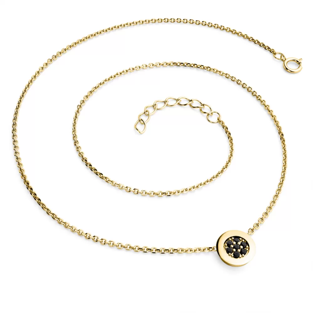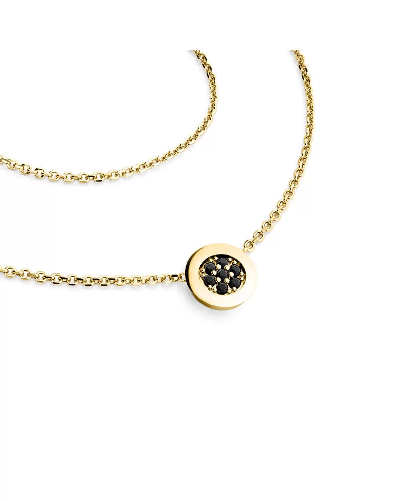Elegantný náhrdelník je vyrobený zo žltého štrnásť karátového zlata - 585/1000 a pozostáva z retiazky kotvičkového typu s lesklými fazetami na každom článku. Fazety sú vyrábané diamantovým nástrojom, ktorý dáva výsledným fazetám maximálny lesk. V strede retiazky je okrúhla ozdoba, v ktorej je osadených sedem okrúhlych čiernych diamantov vybrúsených briliantovým brusom. Diamanty osádzajú naši najskúsenejší majstri zlatníci ručne pod mikroskopom s presnosťou 0,01 mm, a preto nehrozí vypadnutie kameňov ako pri strojovo vyrábaných šperkoch.