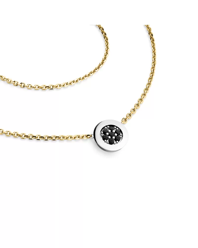 Elegantný náhrdelník je vyrobený z kombinácie žltého a bieleho štrnásť karátového zlata - 585/1000 a pozostáva z retiazky kotvičkového typu s lesklými fazetami na každom článku. Fazety sú vyrábané diamantovým nástrojom, ktorý dáva výsledným fazetám maximálny lesk. V strede retiazky je okrúhla ozdoba, v ktorej je osadených sedem okrúhlych čiernych diamantov vybrúsených briliantovým brusom. Diamanty osádzajú naši najskúsenejší majstri zlatníci ručne pod mikroskopom s presnosťou 0,01 mm, a preto nehrozí vypadnutie kameňov ako pri strojovo vyrábaných šperkoch.