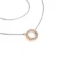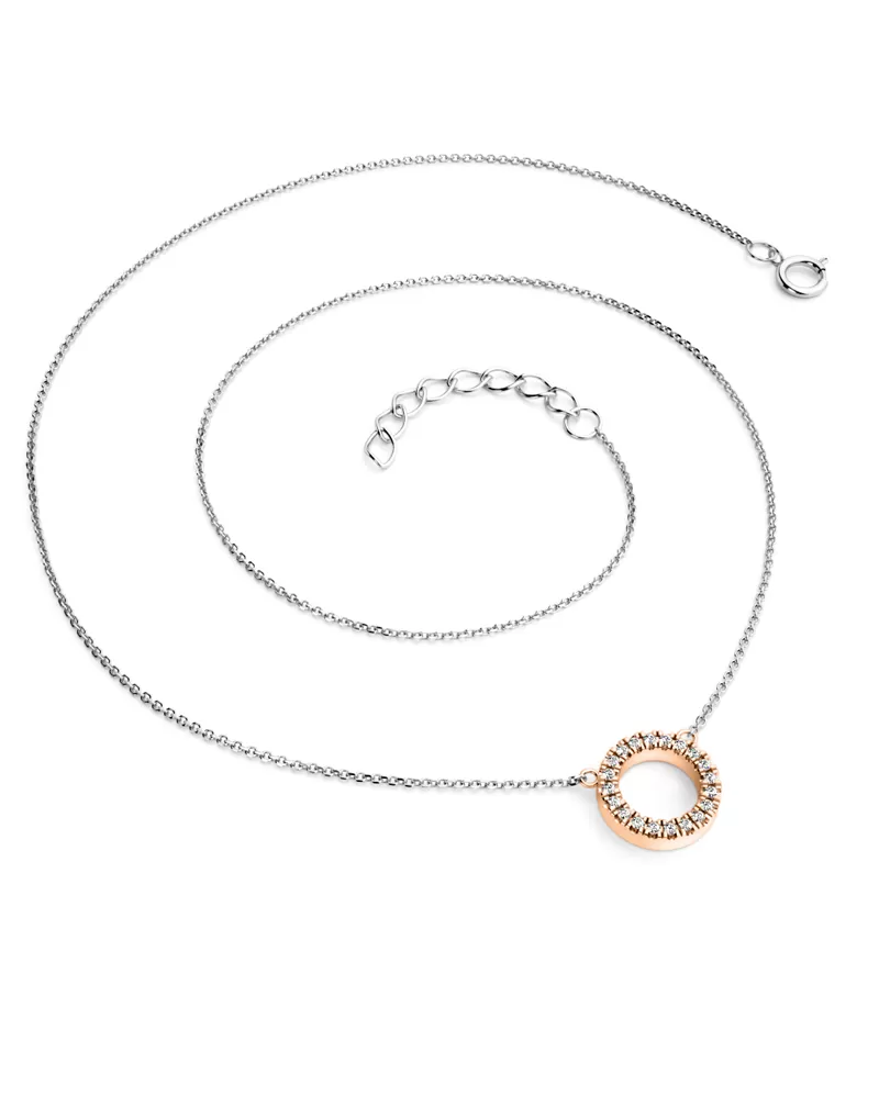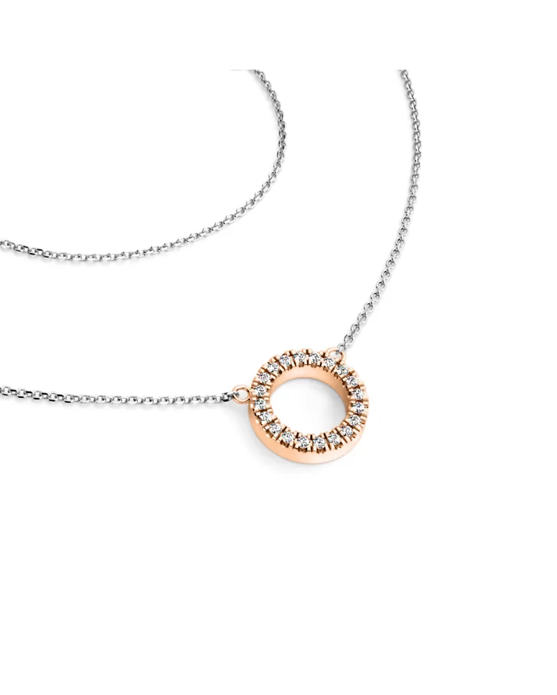 Elegantný náhrdelník sa vyrába v kombinácii bielej a ružovej štrnástich -karátovej zlata - 585/1000 a pozostáva z reťazového typu Anker s lesklými tvárami na každom oku. Bazety sa vyrábajú pomocou diamantového nástroja, ktorý poskytuje výsledné aspekty maximálny lesk. Uprostred reťazca je pevný prívesok v tvare kruhu, v ktorom sú umiestnené dvadsať okrúhlych diamantov, zem s brilantným mletím. Brilantná Skore poskytuje diamanty maximálnu brilanciu leštenej fazety, dokonale odráža svetlo a krásne svieti zo všetkých pohľadov! Diamantové nastavenie vykonávajú naši najskúsenejší majstri ručne ručne pod mikroskopom s presnosťou 0,01 mm, a preto neexistuje riziko, že kamene padajú ako strojové šperky. Symbol kruhu má ochranný znak, kruh symbolizuje údržbu energie a tiež znamená posvätný priestor alebo symbol spojenia.