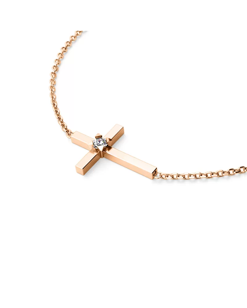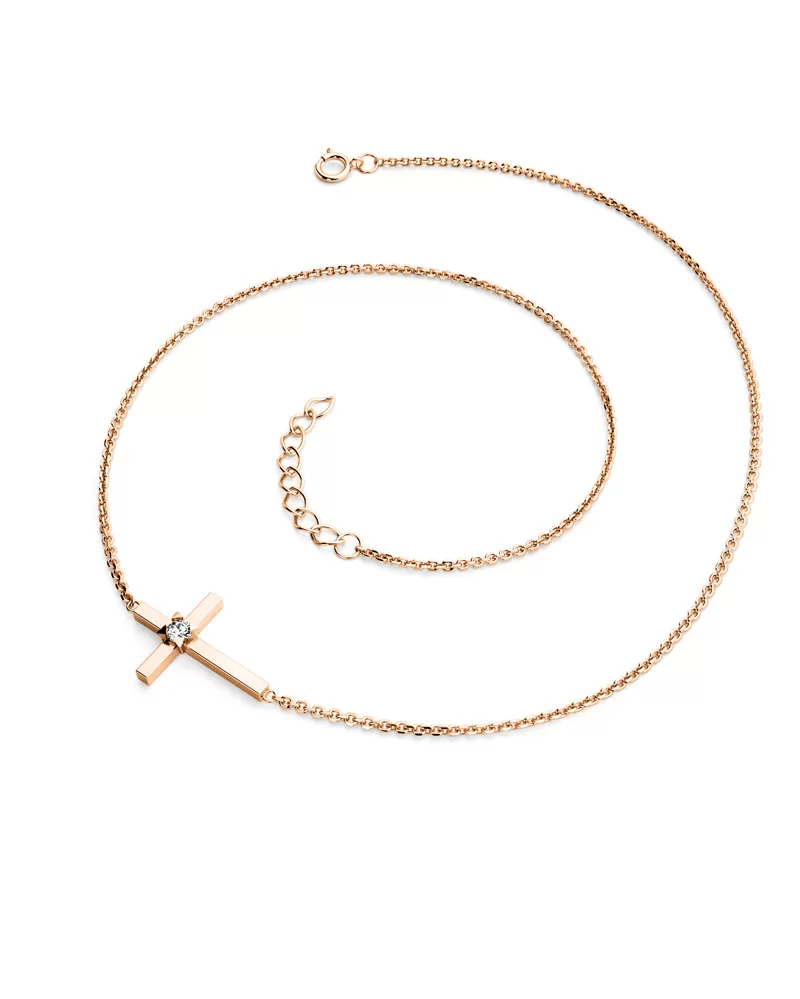 Jednoduchý elegantní náhrdelník je vyrobený z růžového čtrnáctikarátového zlata - 585/1000 a tvoří ho řetízek typu anker s lesklými facetami na každém očku. Facety jsou zhotoveny diamantovým nástrojem, který dodává vzniklým facetám maximální lesk. Uprostřed řetízku je křížek s jedním kulatým diamantem briliantového brusu, který zajišťuje maximální brilanci vybroušených facet, dokonale odráží světlo a neuvěřitelně září z každého úhlu pohledu! Vsazování diamantů provádějí naši nejzkušenější mistři zlatníci ručně pod mikroskopem s přesností na 0,01mm a proto nehrozí vypadnutí kamínků jako to bývá u strojně vyráběných šperků.