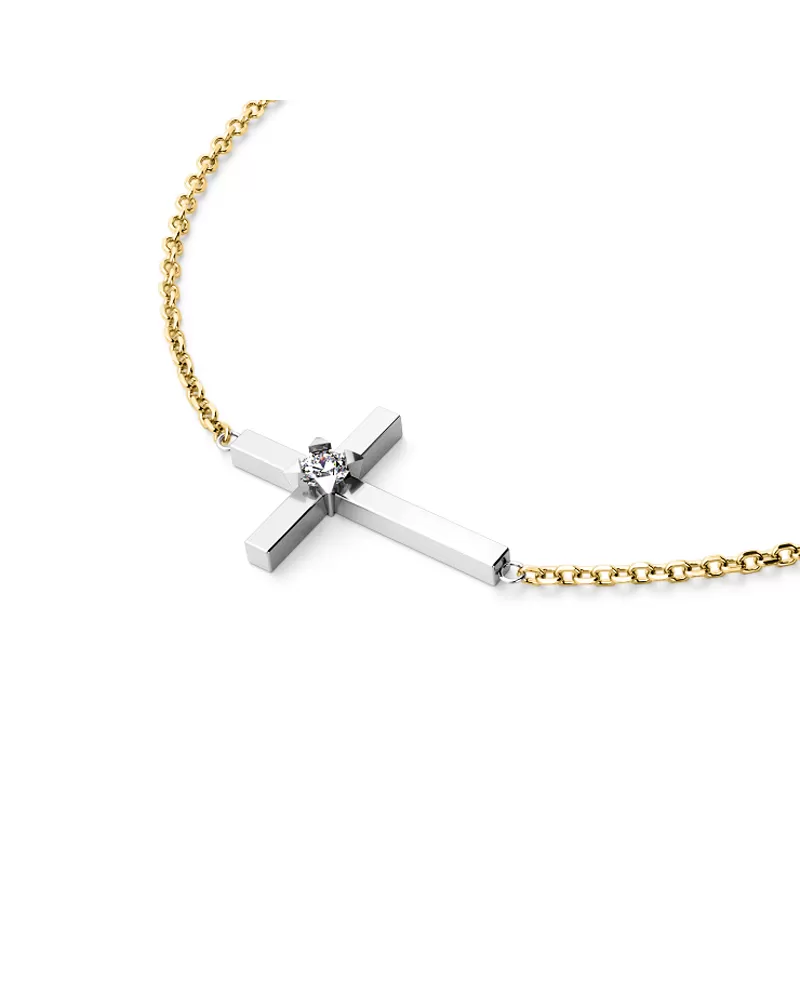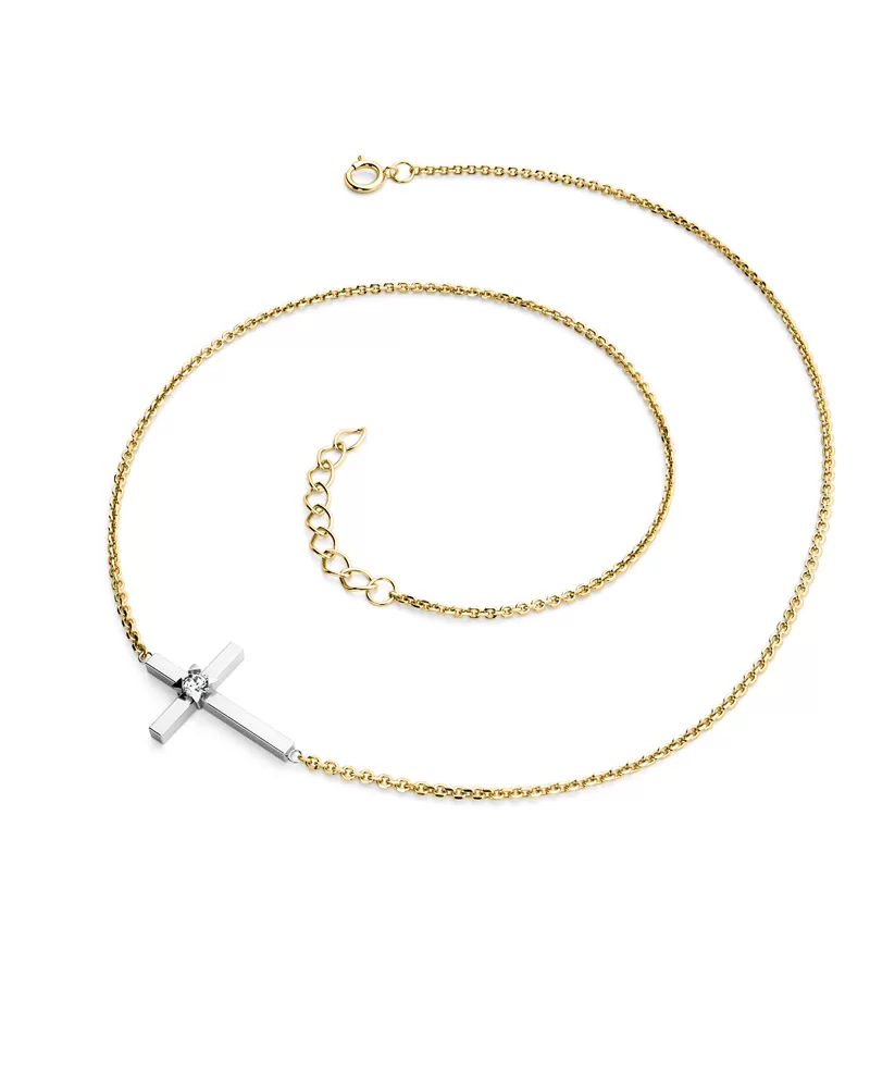 Jednoduchý elegantní náhrdelník je vyrobený ze žlutého a bílého čtrnáctikarátového zlata - 585/1000 a tvoří ho řetízek typu anker s lesklými facetami na každém očku. Facety jsou zhotoveny diamantovým nástrojem, který dodává vzniklým facetám maximální lesk. Uprostřed řetízku je křížek s jedním kulatým diamantem briliantového brusu, který zajišťuje maximální brilanci vybroušených facet, dokonale odráží světlo a neuvěřitelně září z každého úhlu pohledu! Vsazování diamantů provádějí naši nejzkušenější mistři zlatníci ručně pod mikroskopem s přesností na 0,01mm a proto nehrozí vypadnutí kamínků jako to bývá u strojně vyráběných šperků.