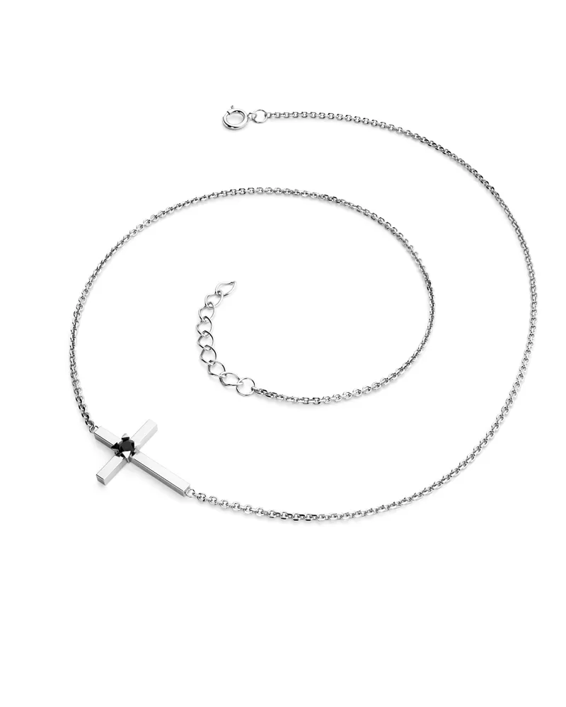 Jednoduchý elegantní náhrdelník je vyrobený z bílého čtrnáctikarátového zlata - 585/1000 a tvoří ho řetízek typu anker s lesklými facetami na každém očku. Facety jsou zhotoveny diamantovým nástrojem, který dodává vzniklým facetám maximální lesk. Uprostřed řetízku je křížek s jedním kulatým černým diamantem briliantového brusu. Náhrdelník vyniká krásným kontrastem bílého zlata a černého diamantu! Vsazování diamantů provádějí naši nejzkušenější mistři zlatníci ručně pod mikroskopem s přesností na 0,01mm a proto nehrozí vypadnutí kamínků jako to bývá u strojně vyráběných šperků.