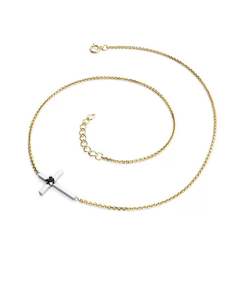 Jednoduchý elegantní náhrdelník je vyrobený ze žlutého a bílého čtrnáctikarátového zlata - 585/1000 a tvoří ho řetízek typu anker s lesklými facetami na každém očku. Facety jsou zhotoveny diamantovým nástrojem, který dodává vzniklým facetám maximální lesk. Uprostřed řetízku je křížek s jedním kulatým černým diamantem briliantového brusu. Náhrdelník vyniká krásným kontrastem žlutého a bílého zlata a černého diamantu! Vsazování diamantů provádějí naši nejzkušenější mistři zlatníci ručně pod mikroskopem s přesností na 0,01mm a proto nehrozí vypadnutí kamínků jako to bývá u strojně vyráběných šperků.