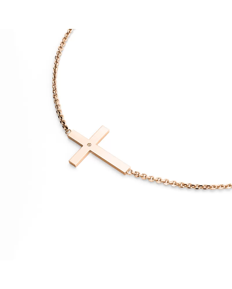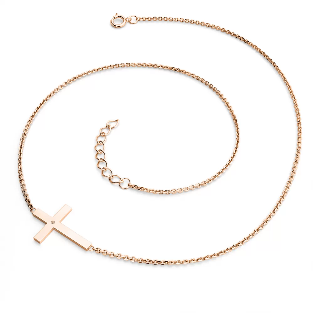 Náhrdelník je vyrobený z růžového čtrnáctikarátového zlata - 585/1000 a tvoří ho řetízek typu anker s lesklými facetami na každém očku. Facety jsou zhotoveny diamantovým nástrojem, který dodává vzniklým facetám krásný lesk a třpyt. Uprostřed řetízku je kříž. Celý náhrdelník je v lesklé povrchové úpravě. V křížku je vsazen jeden kulatý diamant barvy Champagne briliantového brusu, který zajišťuje maximální brilanci vybroušených facet diamantu, dokonale odráží světlo a krásně září z každého úhlu pohledu! Diamant je zatepaný "na hladko" přímo do kříže. Vsazování diamantů provádějí naši nejzkušenější mistři zlatníci ručně pod mikroskopem s přesností na 0,01mm a proto nehrozí vypadnutí kamínků jako to bývá u strojně vyráběných šperků.