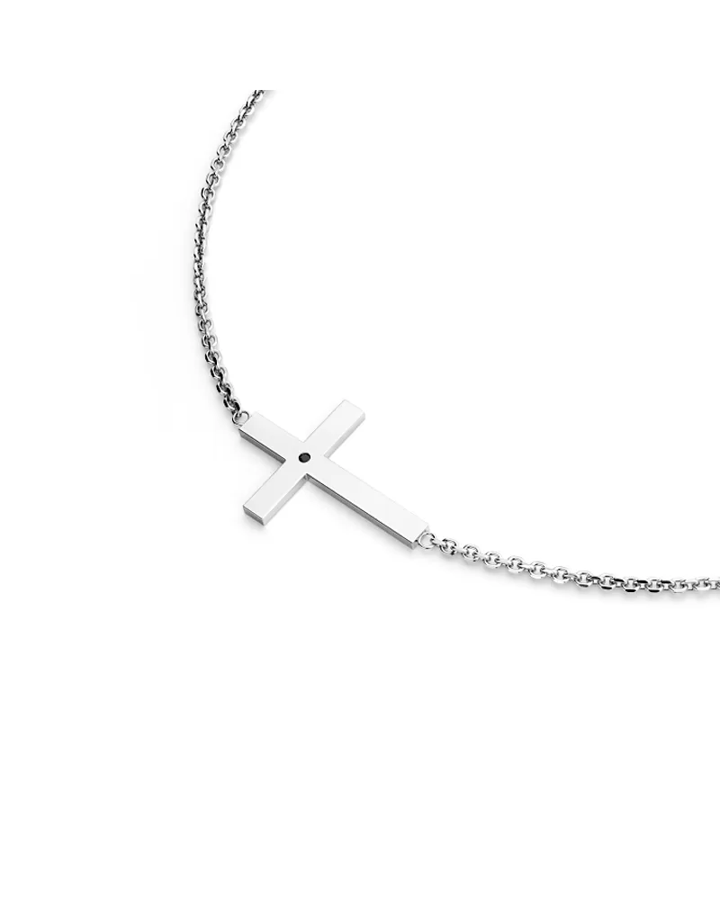 Náhrdelník je vyrobený z bieleho štrnásť karátového zlata - 585/1000 a pozostáva z retiazky kotvičkového typu s lesklými fazetami na každom článku. Fazety sú vyrábané diamantovým nástrojom, ktorý dáva výsledným fazetám krásny lesk a iskru. V strede retiazky je krížik. Celý náhrdelník má lesklý povrch. Do kríža je vsadený jeden okrúhly čierny briliantový diamant. Diamant je vsadený "hladko" priamo do kríža. Diamanty osádzajú naši najskúsenejší majstri zlatníci ručne pod mikroskopom s presnosťou 0,01 mm, a preto nehrozí vypadnutie kameňov ako pri strojovo vyrábaných šperkoch.