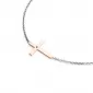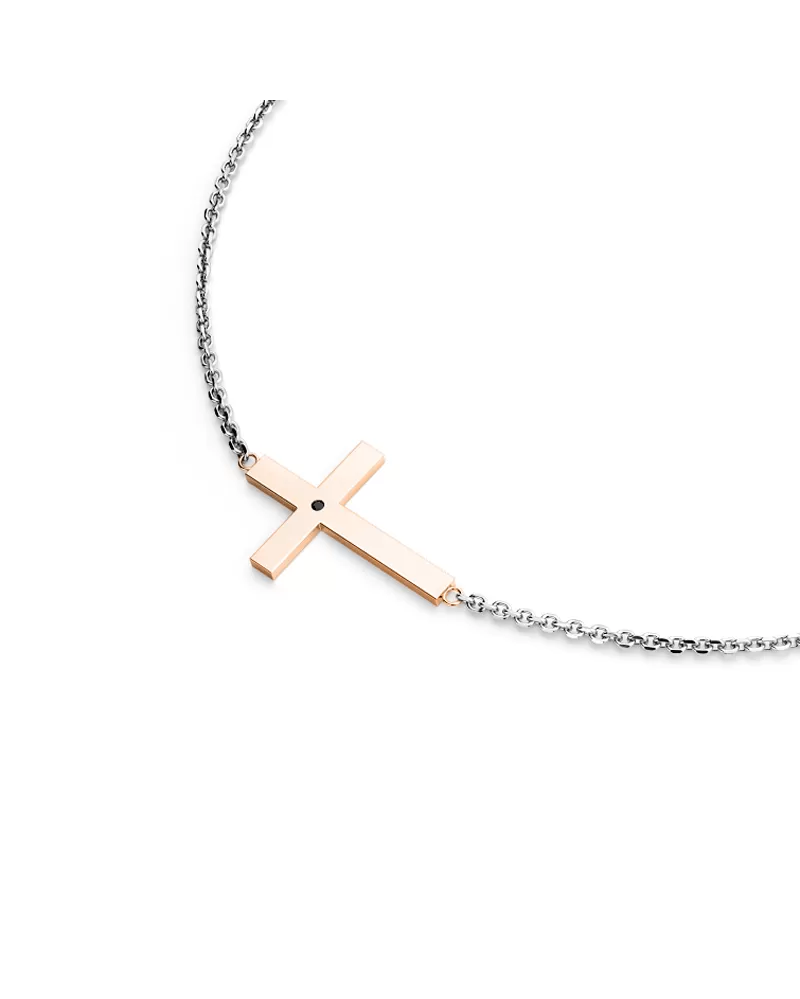 Náhrdelník je vyrobený z kombinácie bieleho a ružového štrnásť karátového zlata - 585/1000 a pozostáva z retiazky kotvičkového typu s lesklými fazetami na každom článku. Fazety sú vyrábané diamantovým nástrojom, ktorý dáva výsledným fazetám krásny lesk a iskru. V strede retiazky je krížik. Celý náhrdelník má lesklý povrch. Do kríža je vsadený jeden okrúhly čierny briliantový diamant. Diamant je vsadený "hladko" priamo do kríža. Diamanty osádzajú naši najskúsenejší majstri zlatníci ručne pod mikroskopom s presnosťou 0,01 mm, a preto nehrozí vypadnutie kameňov ako pri strojovo vyrábaných šperkoch.