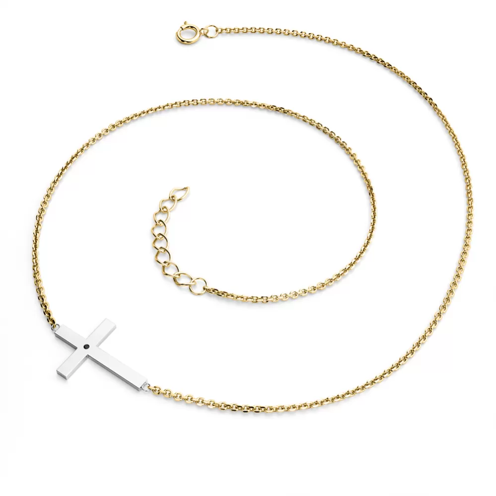 Náhrdelník je vyrobený z kombinácie bieleho a žltého štrnásť karátového zlata - 585/1000 a pozostáva z retiazky kotvičkového typu s lesklými fazetami na každom článku. Fazety sú vyrábané diamantovým nástrojom, ktorý dáva výsledným fazetám krásny lesk a iskru. V strede retiazky je krížik. Celý náhrdelník má lesklý povrch. Do kríža je vsadený jeden okrúhly čierny briliantový diamant. Diamant je vsadený "hladko" priamo do kríža. Diamanty osádzajú naši najskúsenejší majstri zlatníci ručne pod mikroskopom s presnosťou 0,01 mm, a preto nehrozí vypadnutie kameňov ako pri strojovo vyrábaných šperkoch.