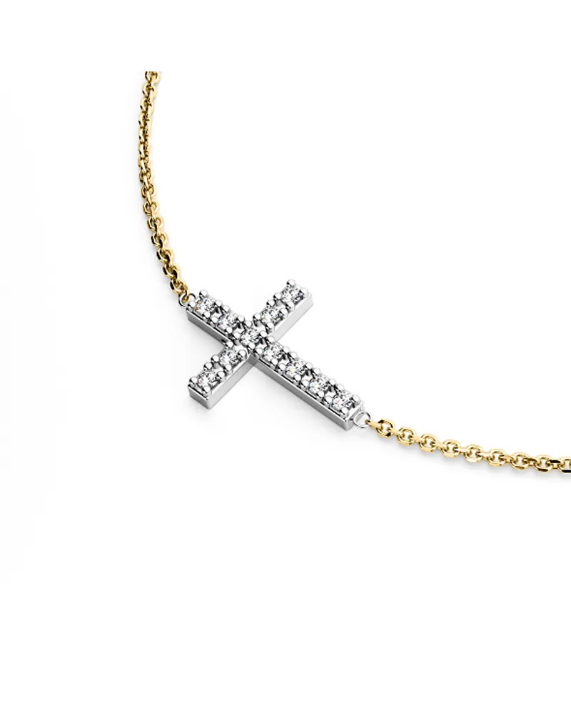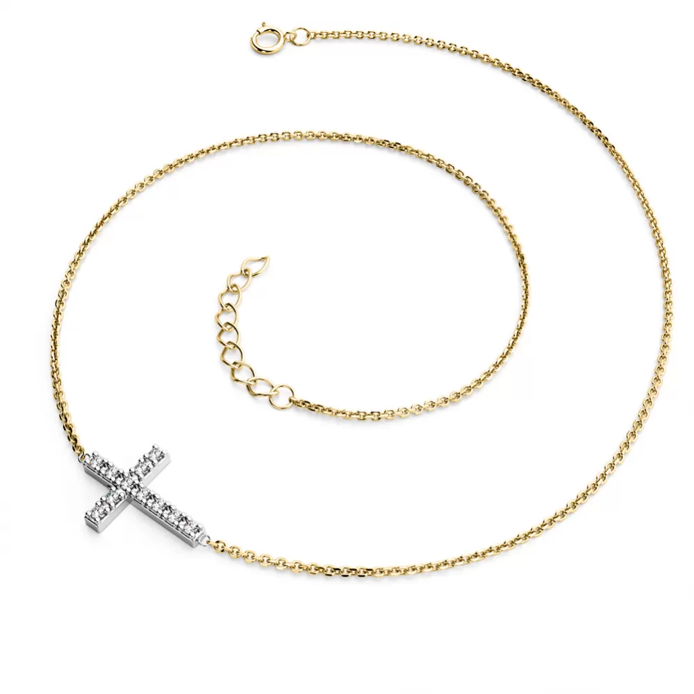 Náhrdelník je vyrobený zo žltého az bieleho štrnásťkarátového zlata - 585/1000 a tvorí ho retiazka typu anker s lesklými facetami na každom očku. Facety sú zhotovené diamantovým nástrojom, ktorý dodáva vzniknutým facetám krásny lesk a ligot. Uprostred retiazky je kríž. Celý náhrdelník je v lesklej povrchovej úprave. V krížiku je vsadených jedenásť okrúhlych diamantov briliantového brusu, ktorý zaisťuje maximálnu brilanciu vybrúsených facet diamantov, dokonale odráža svetlo a krásne žiari z každého uhla pohľadu! Diamanty sú vsadené do krapien. Vsadzovanie diamantov vykonávajú naši najskúsenejší majstri zlatníci ručne pod mikroskopom s presnosťou na 0,01mm a preto nehrozí vypadnutie kamienkov ako to býva pri strojne vyrábaných šperkoch.