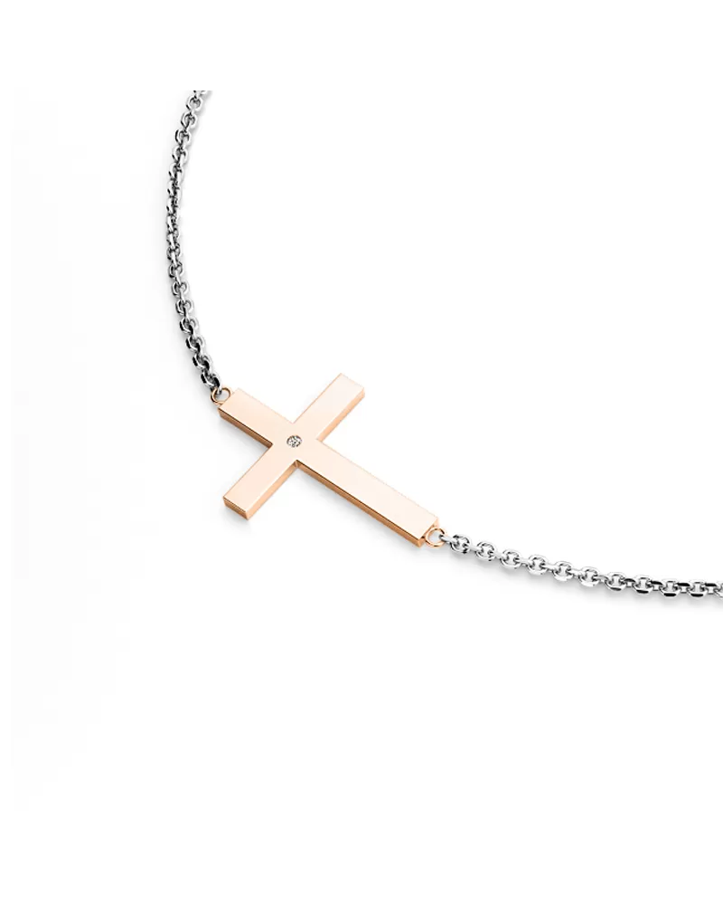 Náhrdelník je vyrobený z kombinácie bieleho a ružového štrnásť karátového zlata - 585/1000 a pozostáva z retiazky kotvičkového typu s lesklými fazetami na každom článku. Fazety sú vyrábané diamantovým nástrojom, ktorý dáva výsledným fazetám krásny lesk a iskru. V strede retiazky je krížik. Celý náhrdelník má lesklý povrch. Do kríža je osadený jeden okrúhly briliantový briliant, ktorý zaisťuje maximálnu brilanciu faziet vybrúseného briliantu, dokonale odráža svetlo a krásne sa leskne z každého pohľadu! Diamant je vsadený "hladko" priamo do kríža. Diamanty osádzajú naši najskúsenejší majstri zlatníci ručne pod mikroskopom s presnosťou 0,01 mm, a preto nehrozí vypadnutie kameňov ako pri strojovo vyrábaných šperkoch.