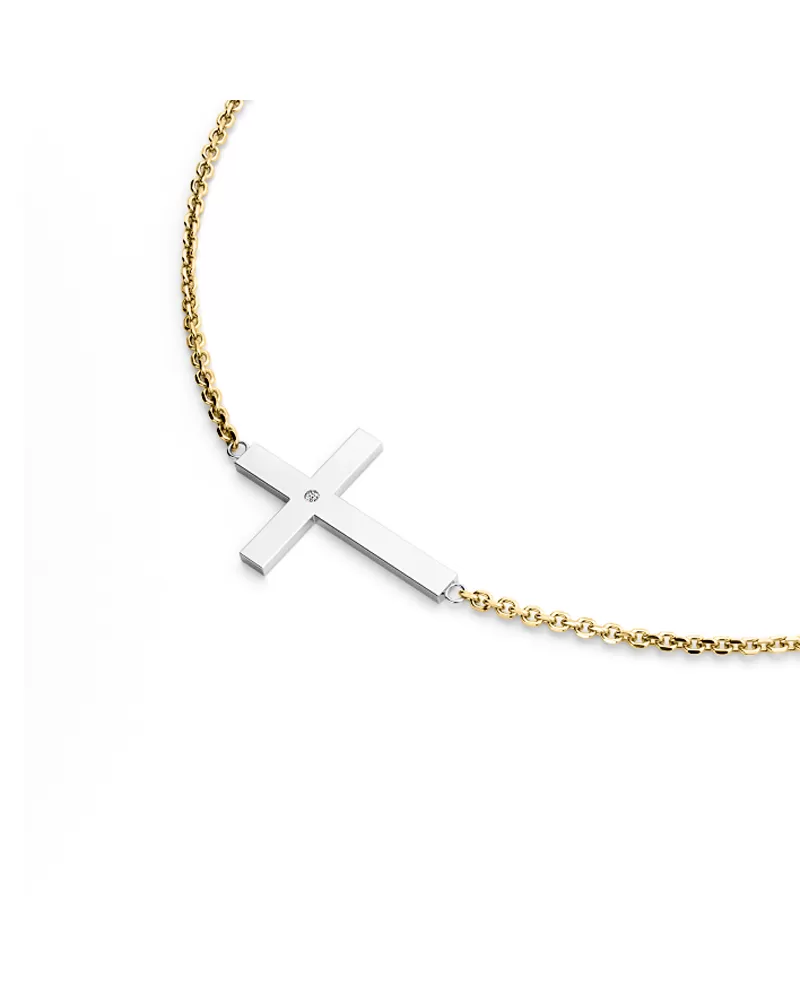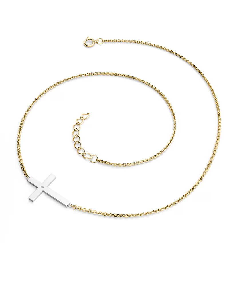 Náhrdelník je vyrobený z kombinácie bieleho a žltého štrnásť karátového zlata - 585/1000 a pozostáva z retiazky kotvičkového typu s lesklými fazetami na každom článku. Fazety sú vyrábané diamantovým nástrojom, ktorý dáva výsledným fazetám krásny lesk a iskru. V strede retiazky je krížik. Celý náhrdelník má lesklý povrch. Do kríža je osadený jeden okrúhly briliantový briliant, ktorý zaisťuje maximálnu brilanciu faziet vybrúseného briliantu, dokonale odráža svetlo a krásne sa leskne z každého pohľadu! Diamant je vsadený "hladko" priamo do kríža. Diamanty osádzajú naši najskúsenejší majstri zlatníci ručne pod mikroskopom s presnosťou 0,01 mm, a preto nehrozí vypadnutie kameňov ako pri strojovo vyrábaných šperkoch.