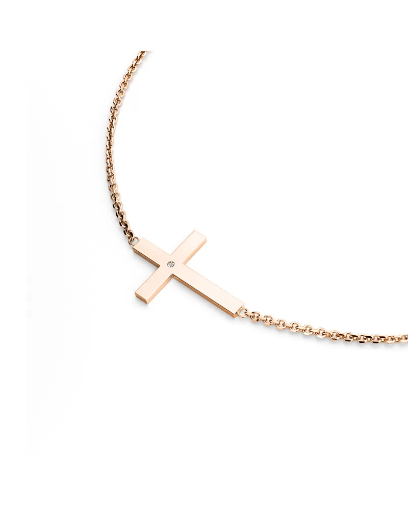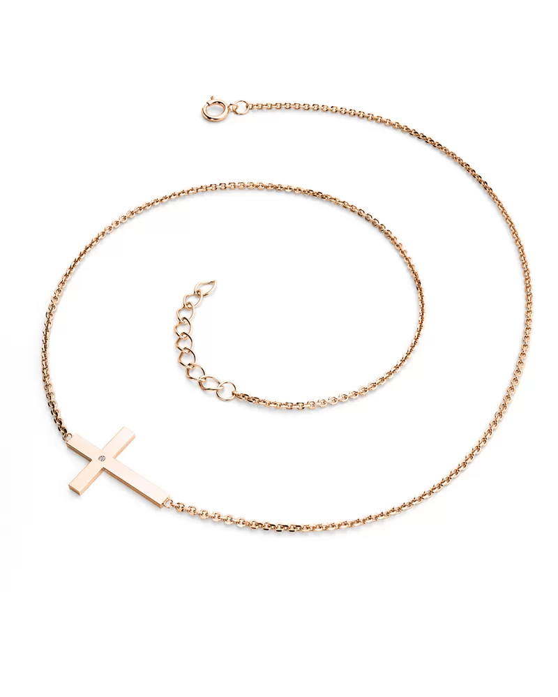 Náhrdelník je vyrobený z ružového štrnásť karátového zlata - 585/1000 a pozostáva z retiazky typu kotva s lesklými fazetami na každom článku. Fazety sú vyrábané diamantovým nástrojom, ktorý dáva výsledným fazetám krásny lesk a iskru. V strede retiazky je krížik. Celý náhrdelník má lesklý povrch. Do kríža je osadený jeden okrúhly briliantový briliant, ktorý zaisťuje maximálnu brilanciu faziet vybrúseného briliantu, dokonale odráža svetlo a krásne sa leskne z každého pohľadu! Diamant je vsadený "hladko" priamo do kríža. Diamanty osádzajú naši najskúsenejší majstri zlatníci ručne pod mikroskopom s presnosťou 0,01 mm, a preto nehrozí vypadnutie kameňov ako pri strojovo vyrábaných šperkoch.