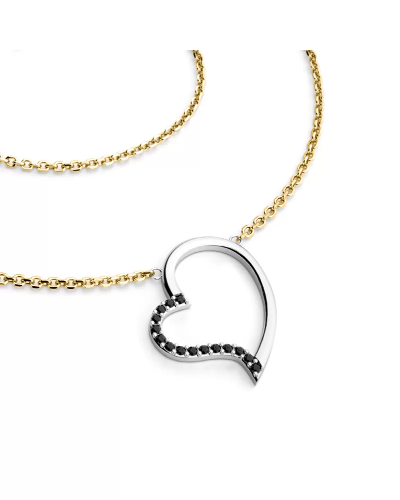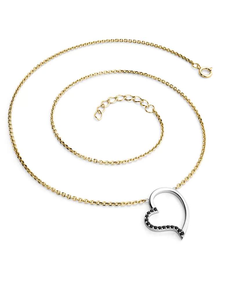 Elegantní náhrdelník je vyrobený v kombinaci žlutého a bílého čtrnáctikarátového zlata - 585/1000 a tvoří ho řetízek typu anker s lesklými facetami na každém očku. Facety jsou zhotoveny diamantovým nástrojem, který dodává vzniklým facetám maximální lesk. Uprostřed řetízku je srdce v kterém je vsazeno patnáct kulatých černých diamantů, vybroušených briliantovým brusem. Vsazování diamantů provádějí naši nejzkušenější mistři zlatníci ručně pod mikroskopem s přesností na 0,01mm a proto nehrozí vypadnutí kamínků jako to bývá u strojně vyráběných šperků.