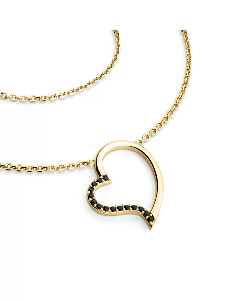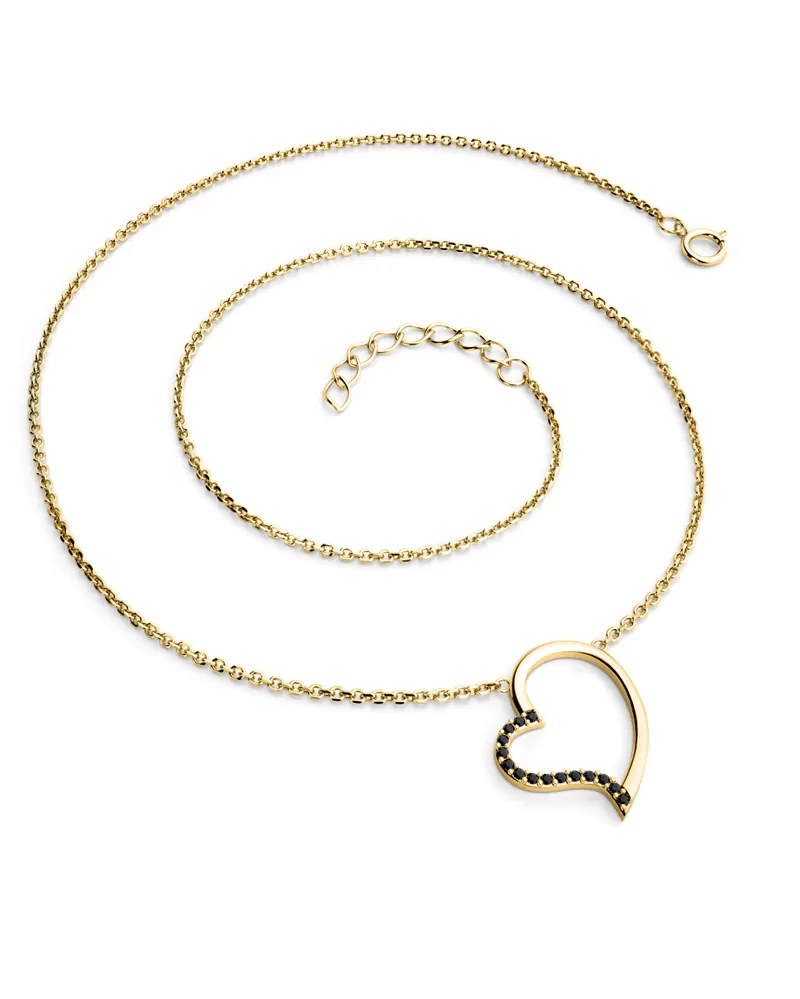 Elegantní náhrdelník je vyrobený ze žlutého čtrnáctikarátového zlata - 585/1000 a tvoří ho řetízek typu anker s lesklými facetami na každém očku. Facety jsou zhotoveny diamantovým nástrojem, který dodává vzniklým facetám maximální lesk. Uprostřed řetízku je srdce v kterém je vsazeno patnáct kulatých černých diamantů, vybroušených briliantovým brusem. Vsazování diamantů provádějí naši nejzkušenější mistři zlatníci ručně pod mikroskopem s přesností na 0,01mm a proto nehrozí vypadnutí kamínků jako to bývá u strojně vyráběných šperků.