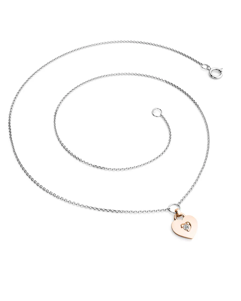 Elegantný náhrdelník je vyrobený z bielej a ružovej štrnástich -karátovej zlata - 585/1000 a pozostáva z reťazového typu Anker s lesklými fazetami na každom oku. Bazety sa vyrábajú pomocou diamantového nástroja, ktorý poskytuje výsledné aspekty maximálny lesk. Uprostred reťazca je na prsteň, do ktorého sa vkladá jeden okrúhly diamant, zavesený prívesok na tvare srdca, zem s brilantným brúsením. Brilantná Brillia poskytuje diamantovú maximálnu brilanciu leštenej aspektu, dokonale odráža svetlo a krásne svieti zo všetkých pohľadov! Diamantové nastavenie vykonávajú naši najskúsenejší majstri ručne pod mikroskopom s presnosťou 0,01 mm, a preto neexistuje riziko kameňov, ako je to pre strojové šperky.