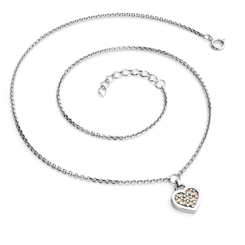 S týmto náhrdelníkom si určite uspejete! Náhrdelník je dokonale spracovaný do najmenších detailov a bude ideálnym darčekom, ktorý určite poteší každú ženu alebo dievča. Skladá sa z reťazového typu Anker s lesklými aspektmi na každom oku. Bazety sa vyrábajú pomocou diamantového nástroja, ktorý poskytuje výsledné aspekty maximálny lesk. Uprostred náhrdelníka sa vkladá srdce. Srdce je symbolom lásky, takže ak chcete priťahovať svoju krásnu lásku a priznať svoju lásku, alebo ukázať svojmu milovaniu, ako sa vám páči a staráte sa o ňu, tento náhrdelník je presne to, čo hľadáte! V srdci je nastavené osem okrúhlych diamantov šampanskej farby, leštené okrúhlym brilantným brúsením, ktoré poskytuje maximálnu brilanciu flexibilných aspektov - dokonale odráža ľahké a neuveriteľné svieti z každého pohľadu! Diamantové nastavenie vykonávajú naši najskúsenejší majstri ručne ručne pod mikroskopom s presnosťou 0,01 mm, a preto neexistuje riziko padajúcich diamantov, ako je v strojových šperkoch.
