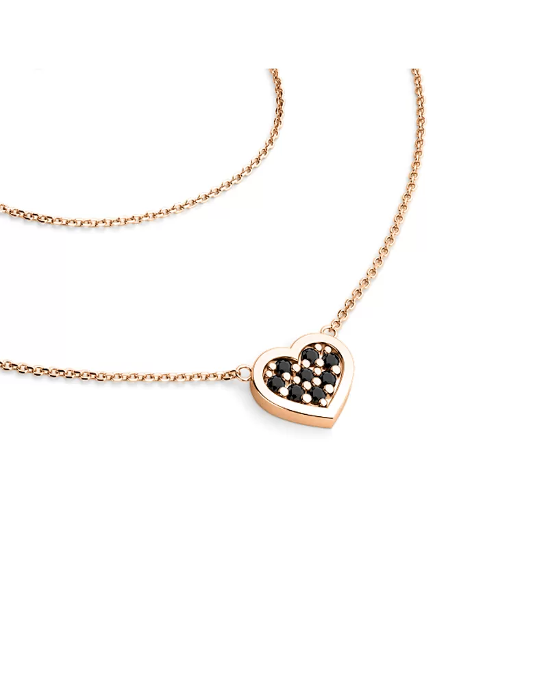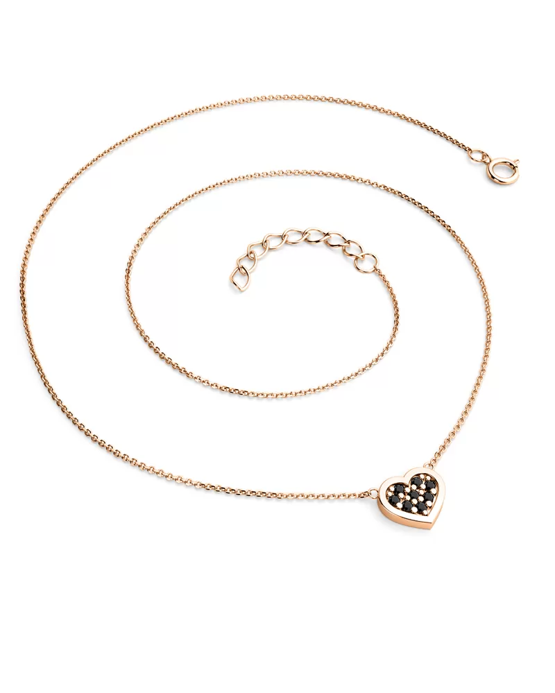 Jednoduchý elegantný náhrdelník pozostáva z reťazového typu Anker s lesklými tvárami na každom oku. Bazety sa vyrábajú pomocou diamantového nástroja, ktorý poskytuje výsledné aspekty maximálny lesk. Uprostred náhrdelníka sa vkladá srdce. Srdce je symbolom lásky, takže ak chcete priťahovať svoju krásnu lásku a priznať svoju lásku, alebo ukázať svojmu milovaniu, ako sa vám páči a staráte sa o ňu, tento náhrdelník je presne to, čo hľadáte! V srdci je nastavené osem okrúhlych čiernych diamantov, zeme s okrúhlym brilantným brúsením. Diamantové nastavenie vykonávajú naši najskúsenejší majstri ručne ručne pod mikroskopom s presnosťou 0,01 mm, a preto neexistuje riziko pádu diamantov, ako je v strojových šperkoch. Náhrdelník vyniká v krásnom kontraste ružového zlata a čiernych diamantov!