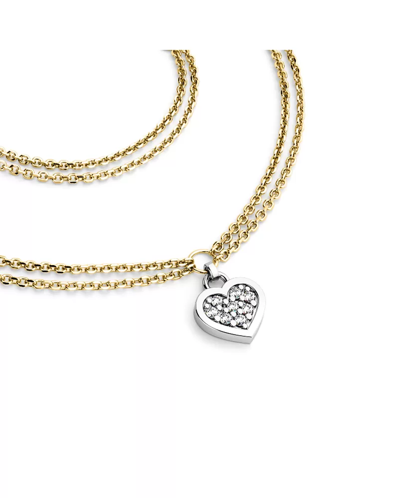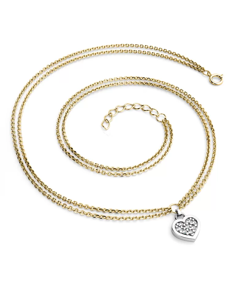 Chcete rozžiariť dekolt Vašej drahej polovičky, ale neviete si rady, čo jej kúpiť? Náš náhrdelník vyrobený zo žltého zlata s diamantmi je presne to, čo hľadáte! Náhrdelník tvorí dve spojené retiazky typu anker s lesklými facetami na každom očku. Uprostred náhrdelníka je krúžok na ktorom je zavesené srdiečko z bieleho zlata. Srdce je symbolom lásky, takže ak chcete svoju milú zaujať a vyznať jej lásku, alebo svojej blízkej osobe ukázať, ako ju máte radi a záleží vám na ňu, tento náhrdelník je presne to, čo hľadáte! V srdiečku je vsadených osem okrúhlych diamantov, vybrúsených okrúhlym briliantovým brusom, ktorý zaisťuje maximálnu brilanciu vybrúsených facet zo všetkých uhlov pohľadu! Vsadzovanie diamantov vykonávajú naši najskúsenejší majstri zlatníci ručne pod mikroskopom s presnosťou na 0,01mm a preto nehrozí vypadnutie diamantov ako to býva pri strojne vyrábaných šperkoch.
