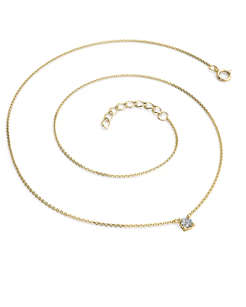 Jednoduchý elegantní náhrdelník je vyrobený ze žlutého čtrnáctikarátového zlata - 585/1000 a tvoří ho řetízek typu anker s lesklými facetami na každém očku. Facety jsou zhotoveny diamantovým nástrojem, který dodává vzniklým facetám maximální lesk. Na řetízku je zavěšen v pevné čtyřkrapnové korunce jeden kulatý diamant briliantového brusu, který zajišťuje maximální brilanci vybroušených facet, dokonale odráží světlo a neuvěřitelně září z každého úhlu pohledu! Vsazování diamantů provádějí naši nejzkušenější mistři zlatníci ručně pod mikroskopem s přesností na 0,01mm a proto nehrozí vypadnutí kamínků jako to bývá u strojně vyráběných šperků.