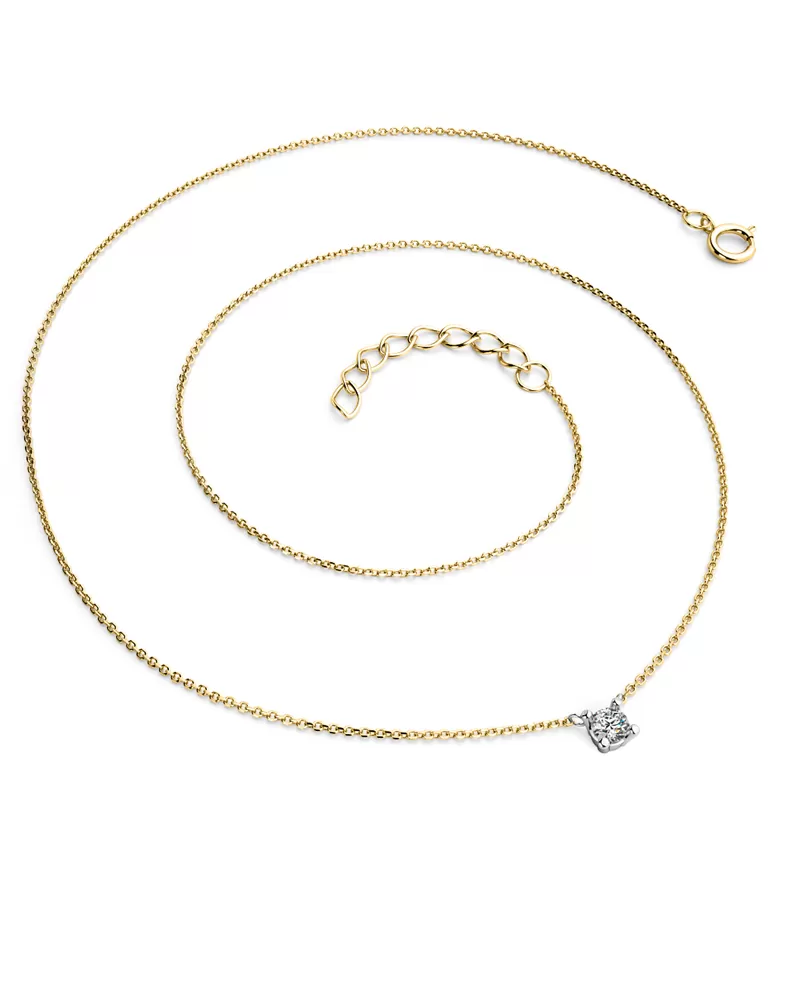 Jednoduchý elegantní náhrdelník je vyrobený ze žlutého a bílého čtrnáctikarátového zlata - 585/1000 a tvoří ho řetízek typu anker s lesklými facetami na každém očku. Facety jsou zhotoveny diamantovým nástrojem, který dodává vzniklým facetám maximální lesk. Na řetízku je zavěšen v pevné čtyřkrapnové korunce jeden kulatý diamant briliantového brusu, který zajišťuje maximální brilanci vybroušených facet, dokonale odráží světlo a neuvěřitelné září z každého úhlu pohledu! Vsazování diamantů provádějí naši nejzkušenější mistři zlatníci ručně pod mikroskopem s přesností na 0,01mm a proto nehrozí vypadnutí kamínků jako to bývá u strojně vyráběných šperků.