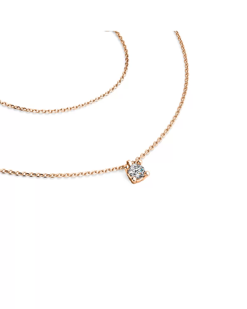 Jednoduchý elegantní náhrdelník je vyrobený z růžového čtrnáctikarátového zlata - 585/1000 a tvoří ho řetízek typu anker s lesklými facetami na každém očku. Facety jsou zhotoveny diamantovým nástrojem, který dodává vzniklým facetám maximální lesk. Na řetízku je zavěšen v pevné čtyřkrapnové korunce jeden kulatý diamant briliantového brusu, který zajišťuje maximální brilanci vybroušených facet, dokonale odráží světlo a neuvěřitelné září z každého úhlu pohledu! Vsazování diamantů provádějí naši nejzkušenější mistři zlatníci ručně pod mikroskopem s přesností na 0,01mm a proto nehrozí vypadnutí kamínků jako to bývá u strojně vyráběných šperků.